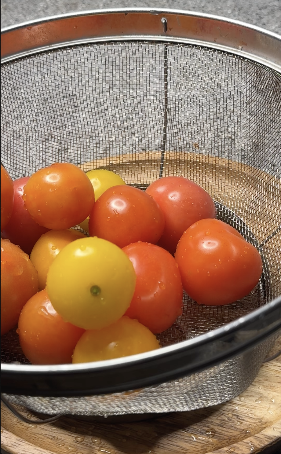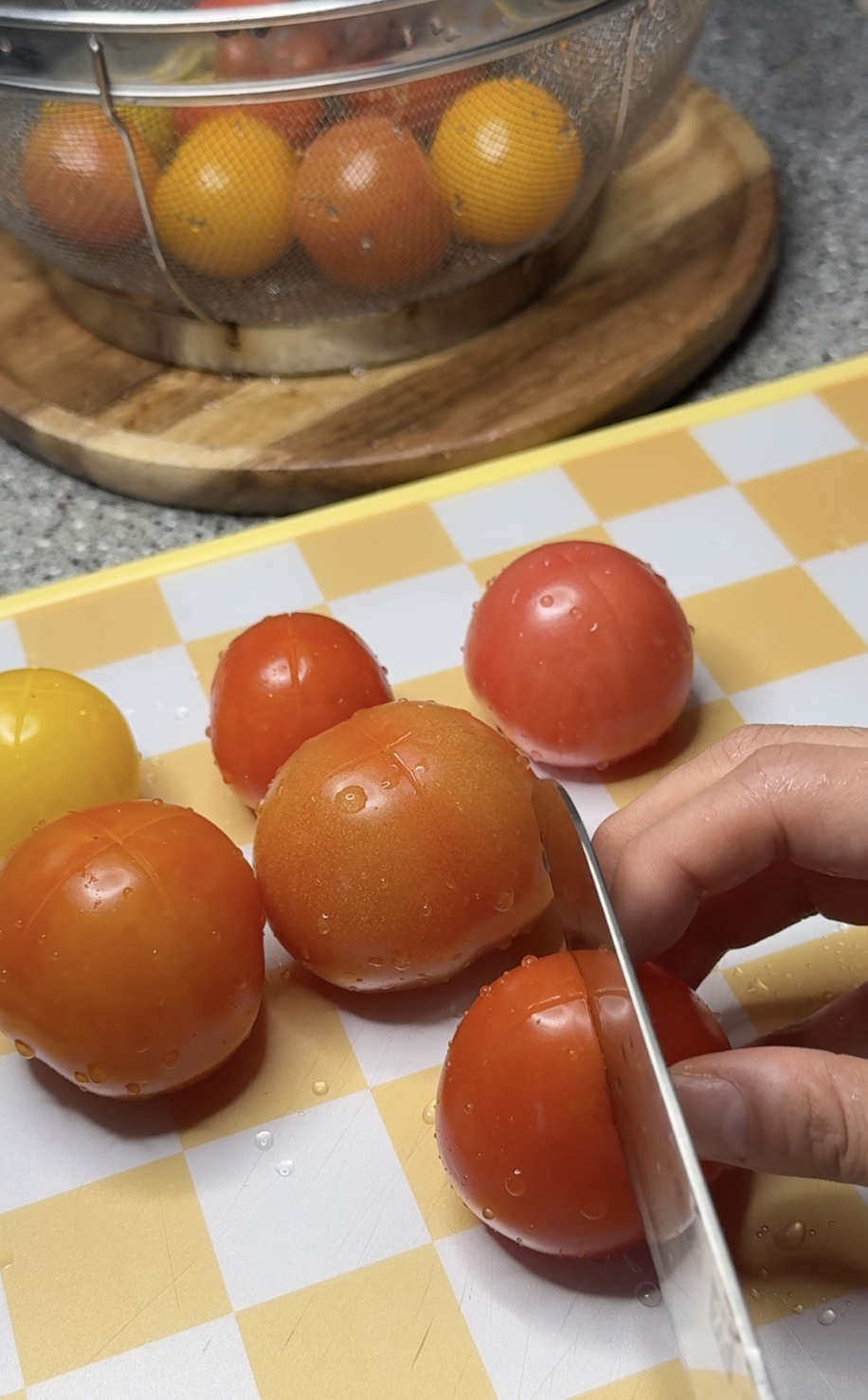 제가 준비한 토마토는 한입 크기보다 조금 커서 먹기 좋게 잘라주었어요. 취향에 맞게 크기를 조절해 주세요.