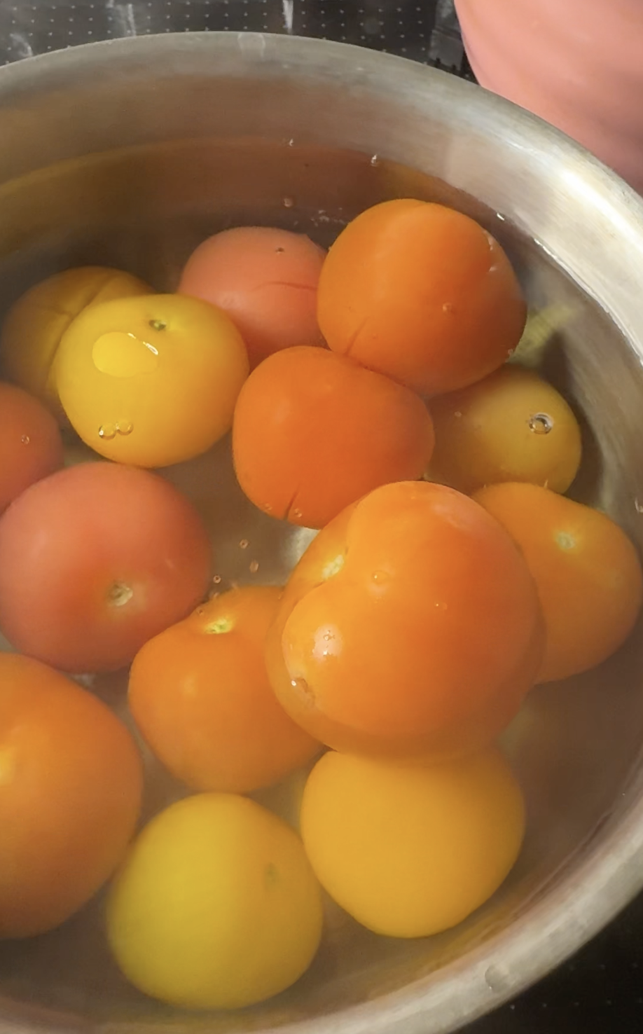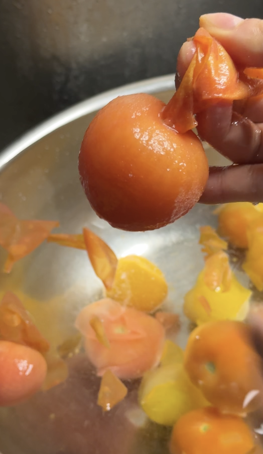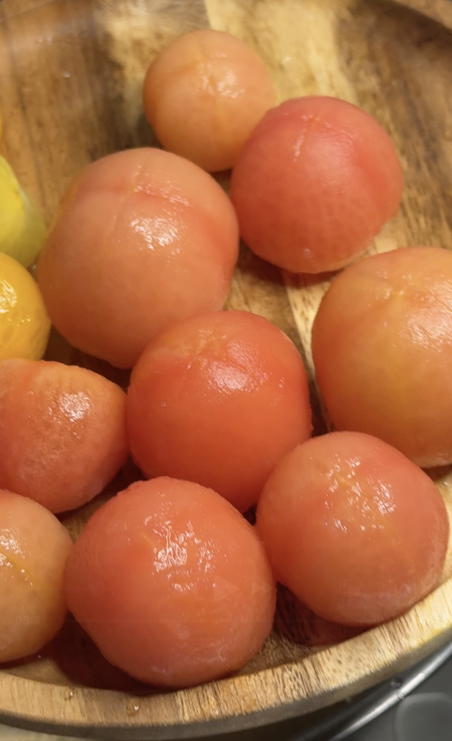 토마토는 양념이 잘 배도록 껍질을 벗겨줄 거예요.
