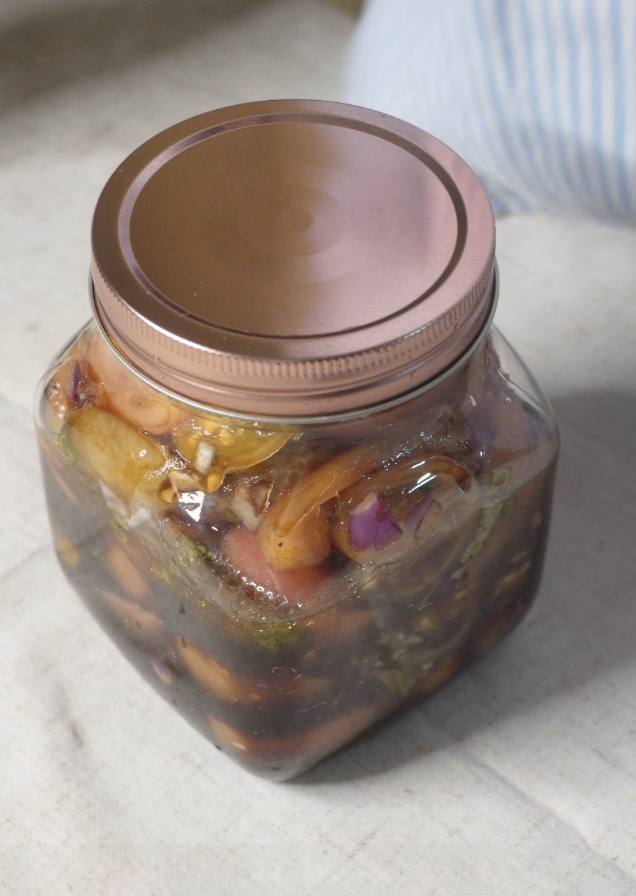 유리병에 담아 냉장고에서 하룻밤 숙성했습니다. 간이 잘 배도록 최소 30분 이상 숙성시켜 주세요.