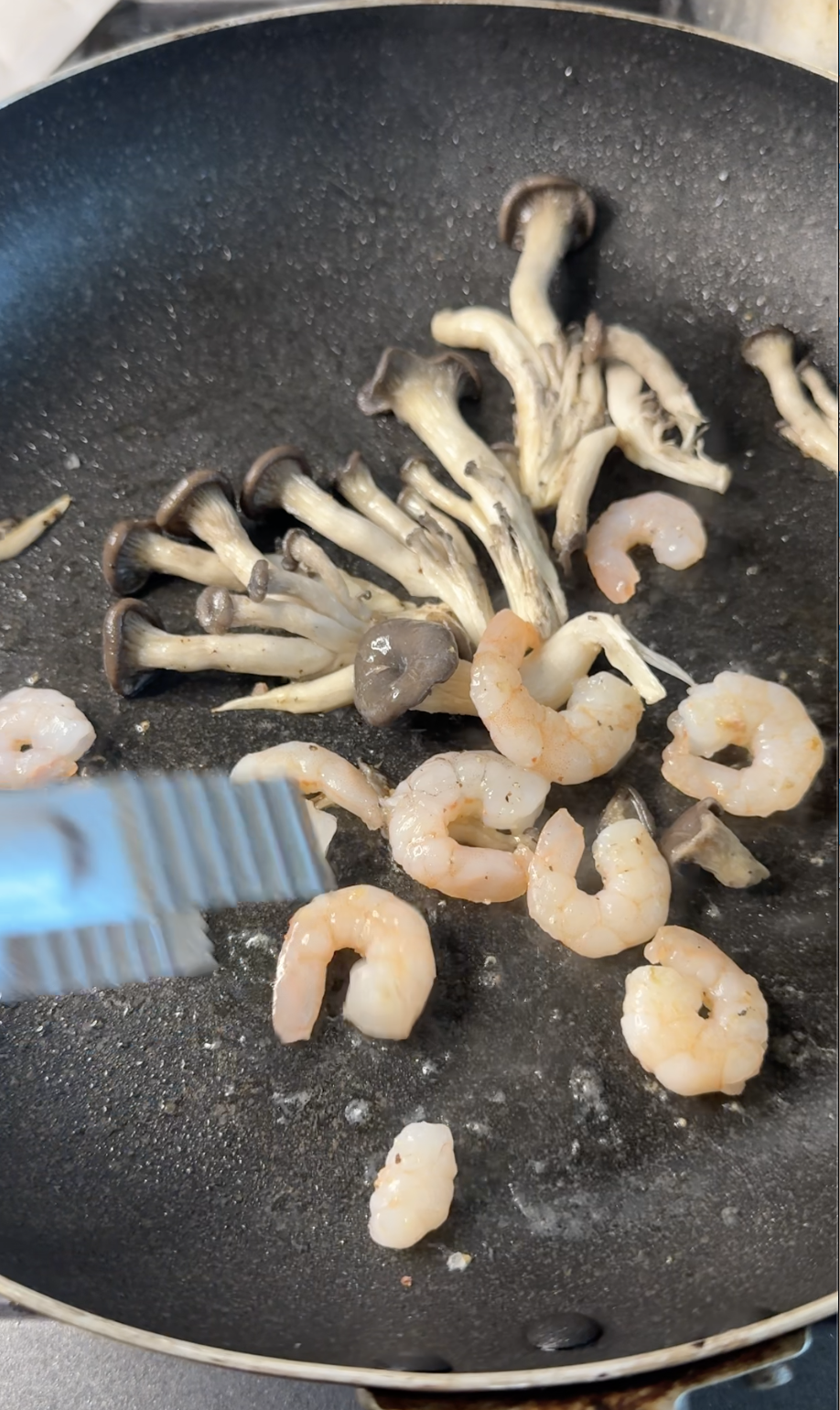 파스타 면을 삶고, 새우와 버섯을 구워 준비합니다.