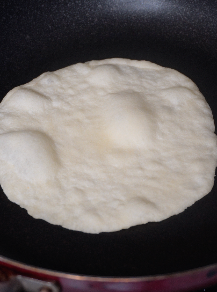 팬을 약불로 달군 뒤, 한 면이 어느 정도 부풀어 오르면 뒤집어 다른 면도 익혀주세요. 이때 기름은 따로 두르지 않아도 됩니다.
