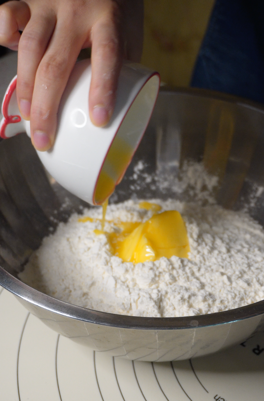 먼저 밀가루에 녹인 버터를 넣고 골고루 섞어줍니다.