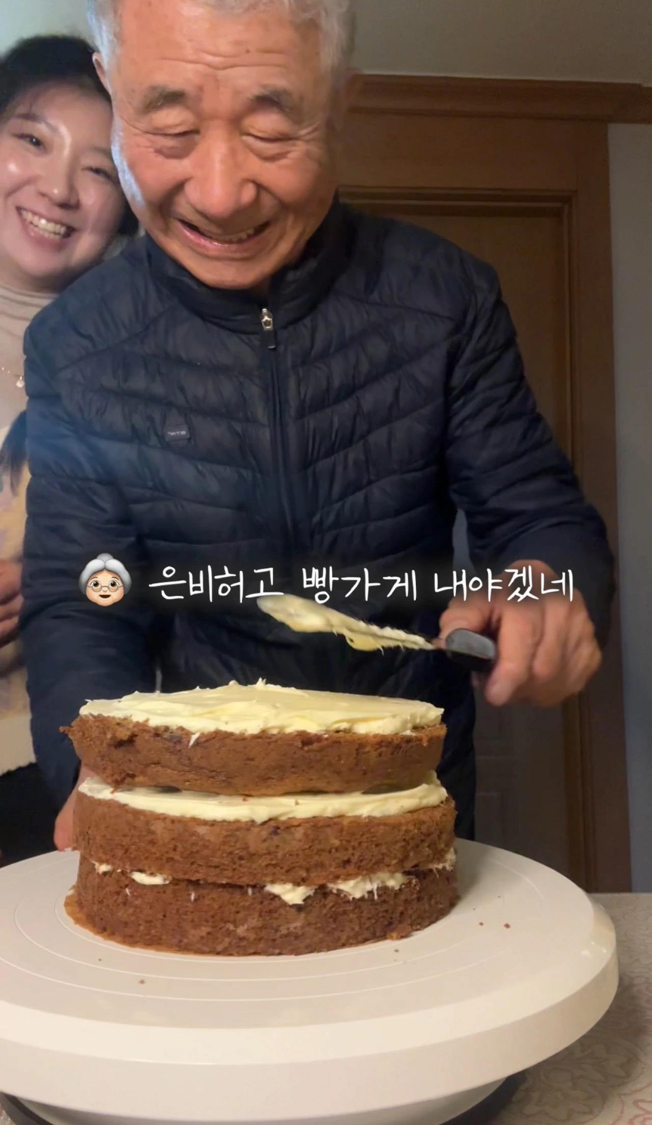 할아버지와 아빠 생일케이크 만들기. 할아버지가 예상외로 섬세하게 아이싱(케이크 겉면에 크림 바르기) 하셔서 깜짝 놀랐다. 할아버지 다음에 또 같이 만들어요~