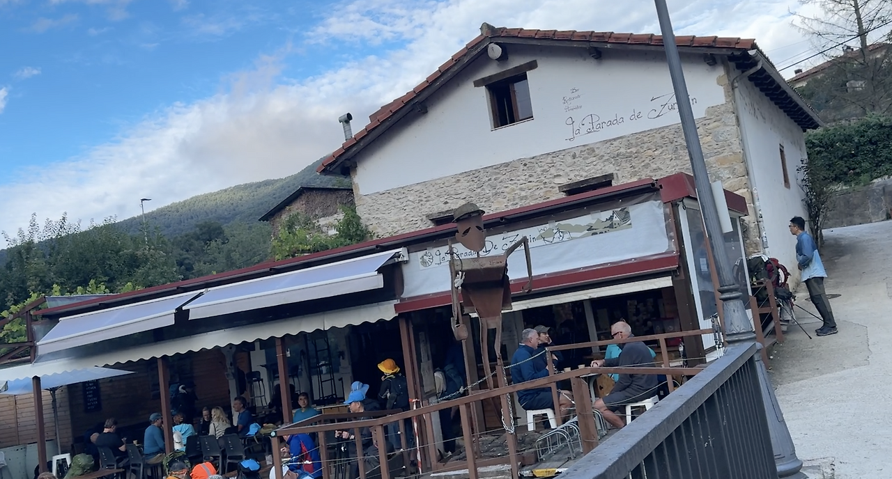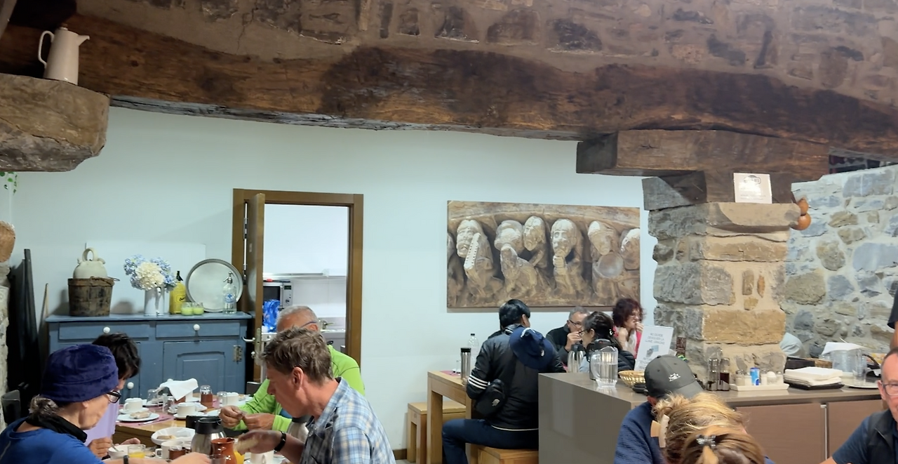 오늘도 잠을 못 잤다. 새벽에 누군가 계속 코를 골아서.... '순례길은 편하러 온 게 아니니' 하며 아침에 비몽사몽으로 일어났다. 오늘의 아침은 빵 오렌지 주스, 아직 이른 새벽 딱히 먹고 싶진 않았지만 걷기 위해 먹었다. 순례자들이 오순도순 모여 식사를 하는 시간은 언제가 활기차다.