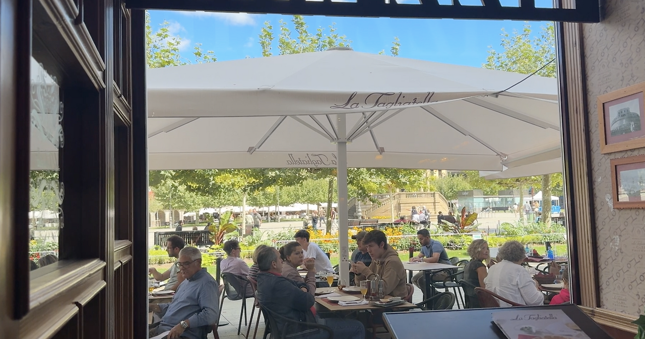 거리 공연, 사람들 대화 소리, 테라스에 앉아 있는 사람들 등 각양각색의 움직임으로 도심의 에너지가 살아있다.