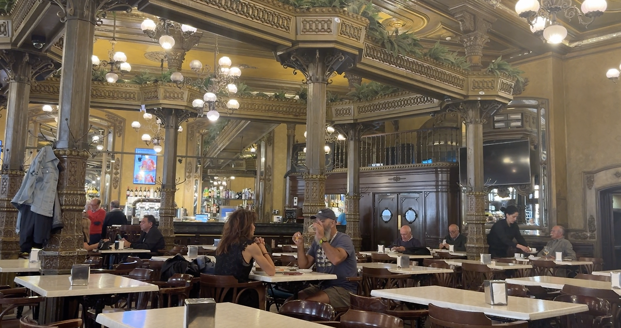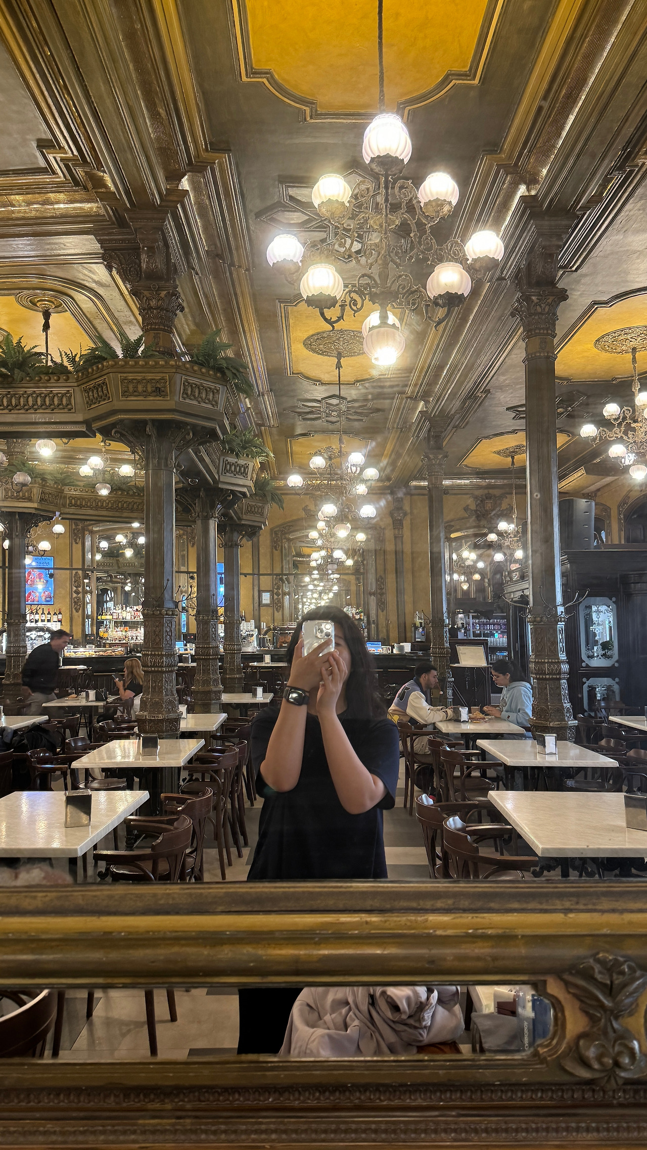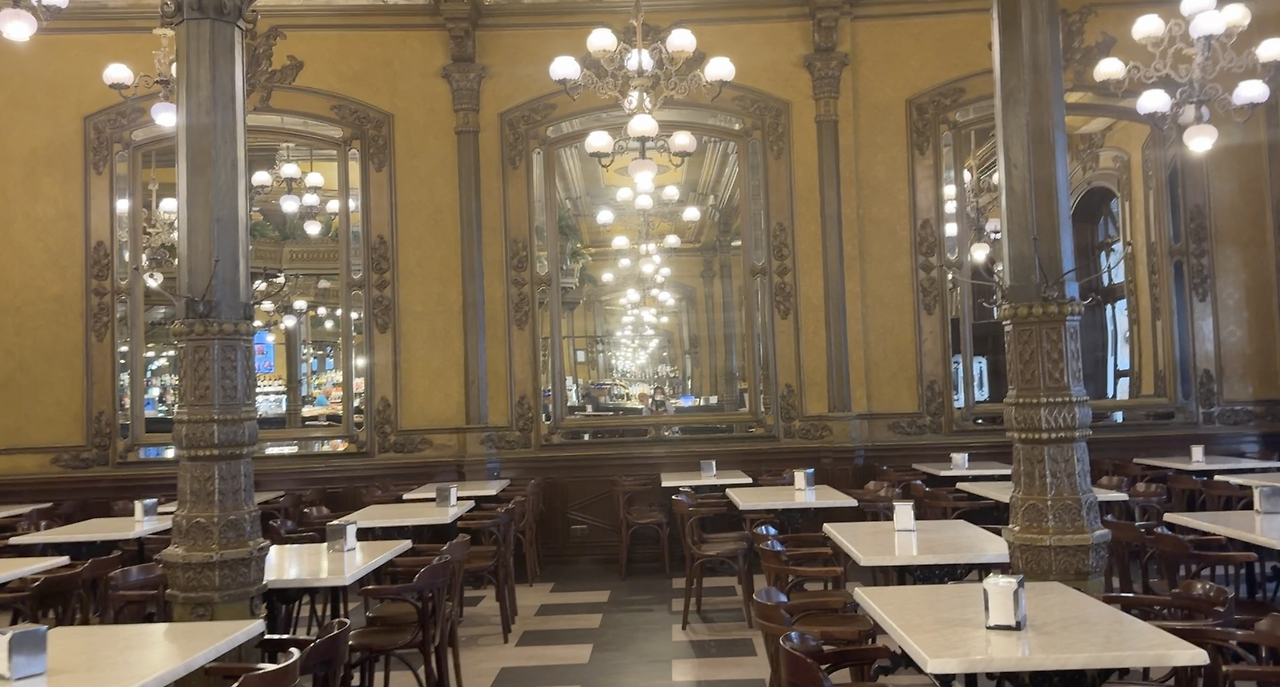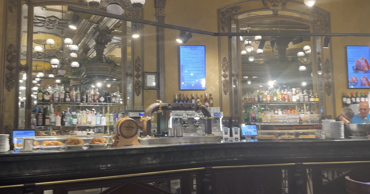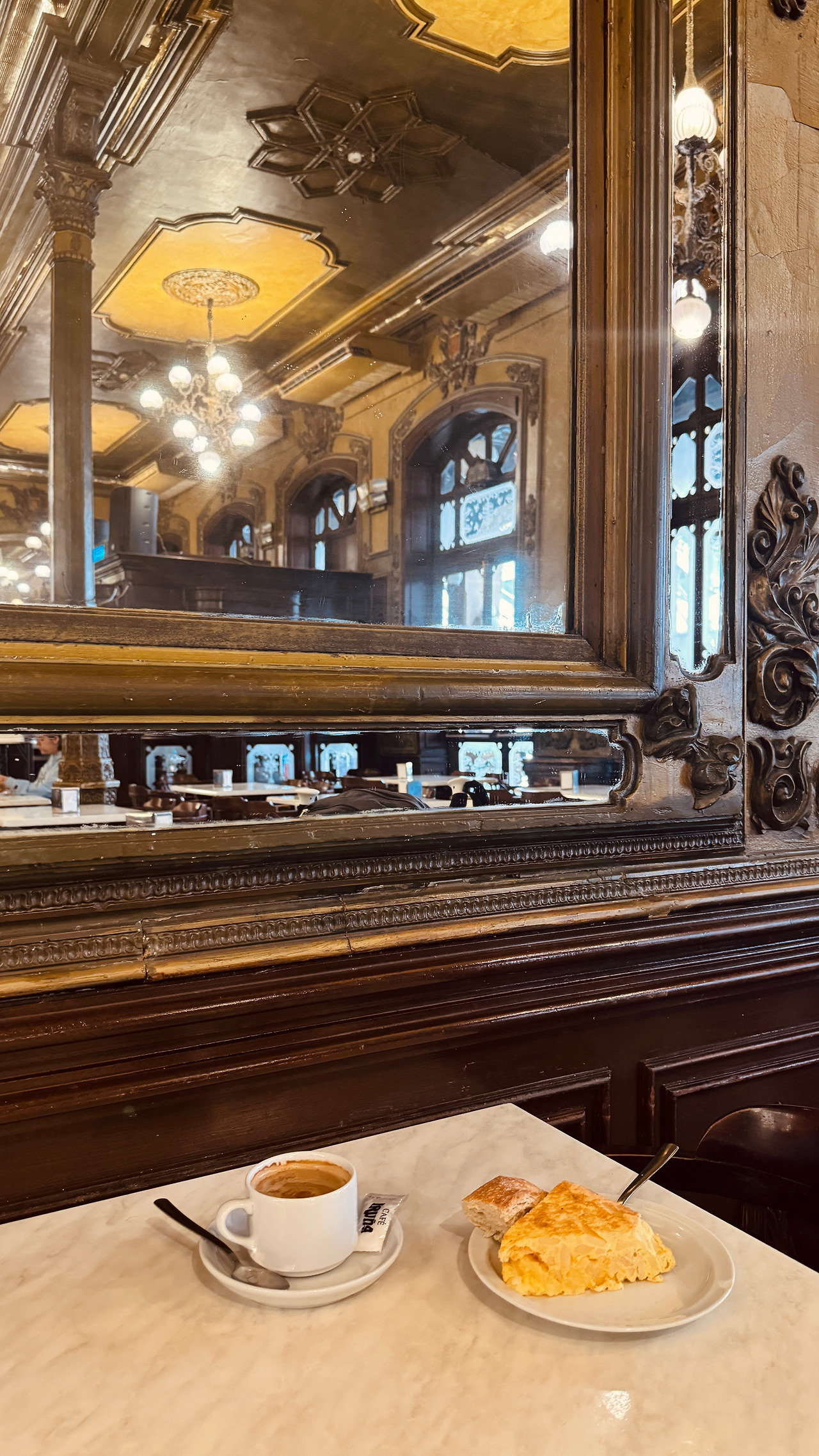 나는 오픈하자마자 카페에 들어갔다. 들어가자마자 고풍스러운 분위기와 큰 거울이 미추는 공간에 압도되었다. 나는 카페콘레체와 토르티야를 시키고 자리를 잡았다.