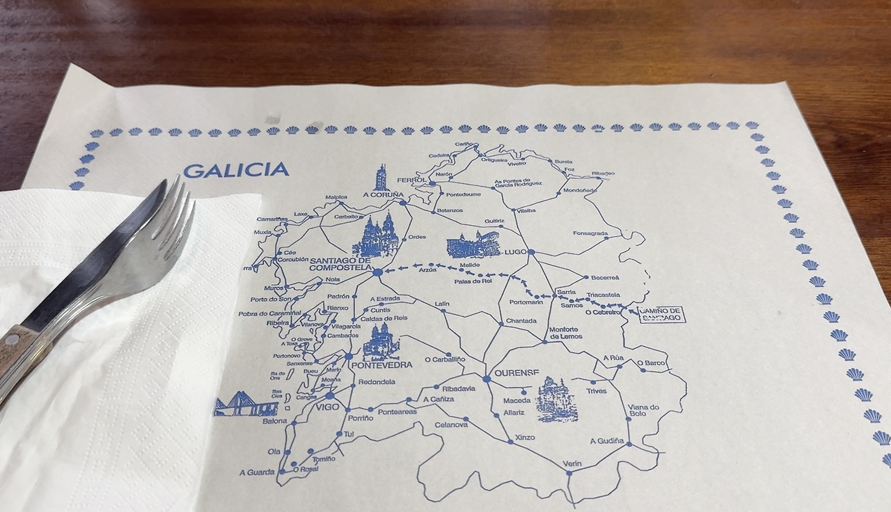 테이블종이가 독특하다. 갈리시아 지방의 프라이드가 담겨있다. 이곳에서부터 산티아고 대성당까지의 여정을 나타낸 지도이다.