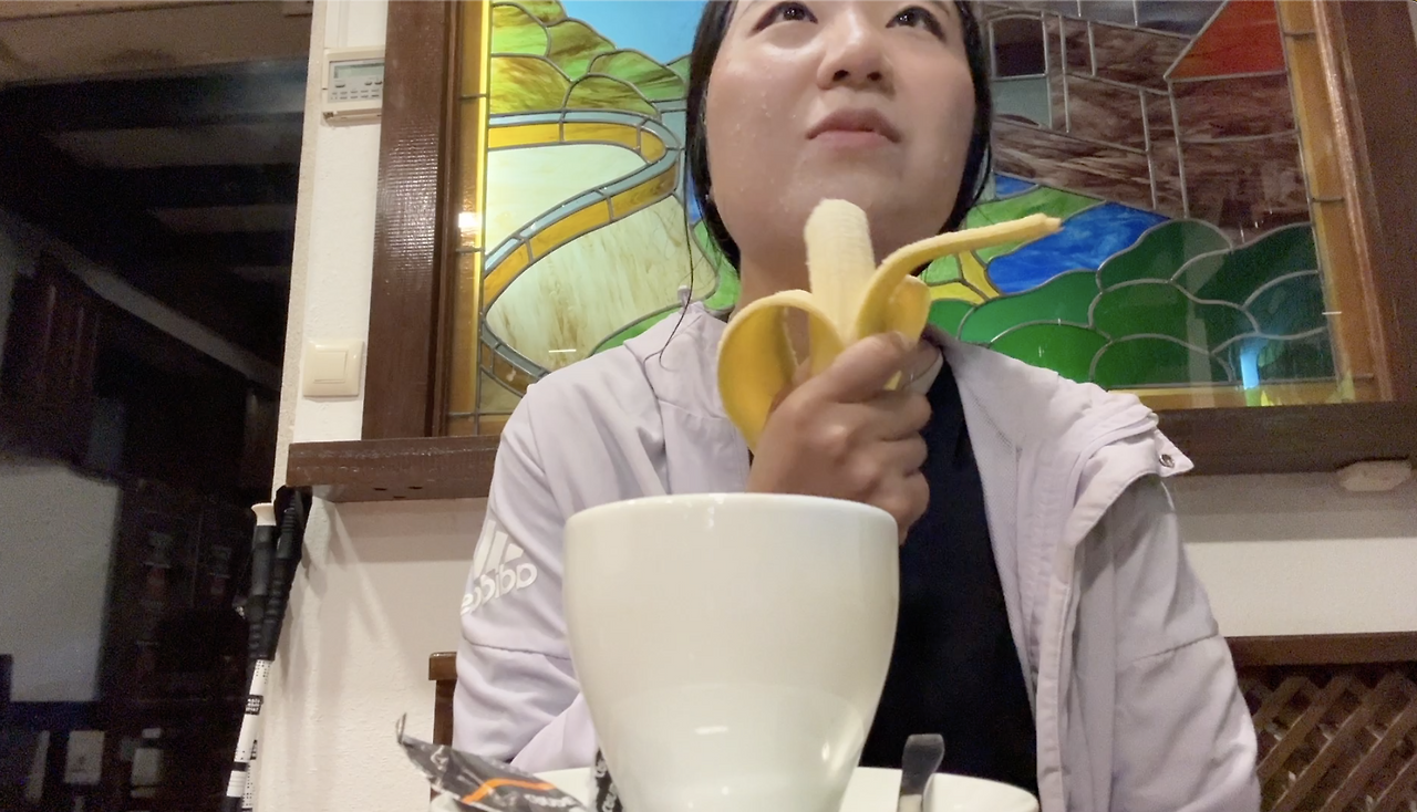 이탈리아 순례자 한 명을 만나 같이 걷다가 카페로 들어왔다. 머리, 얼굴, 옷, 신발 젖지 않은 곳이 없다. 물에 빠진 생쥐꼴이 되었다. 따뜻한 커피와 바나나를 아침으로 먹었다.