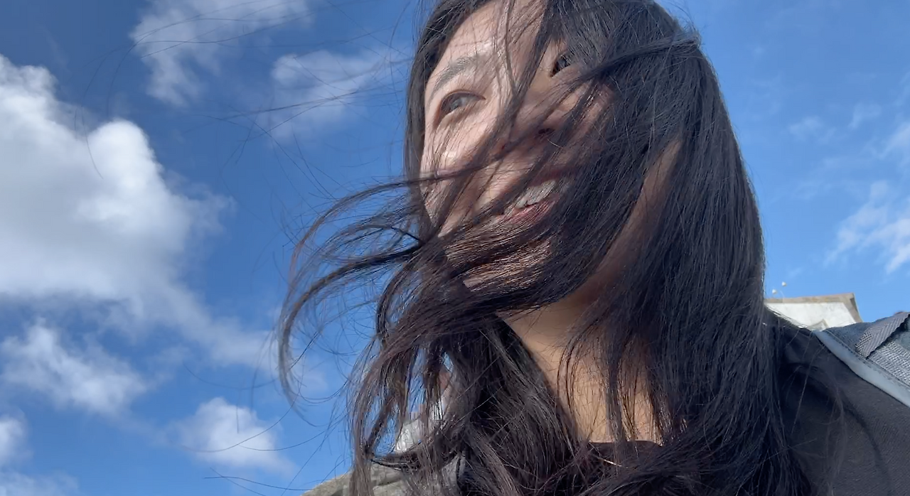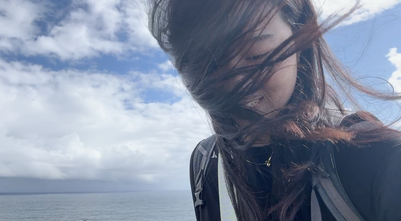 바닷바람이 매우 거세서 머리카락이 아주 사방으로 휘날린다.