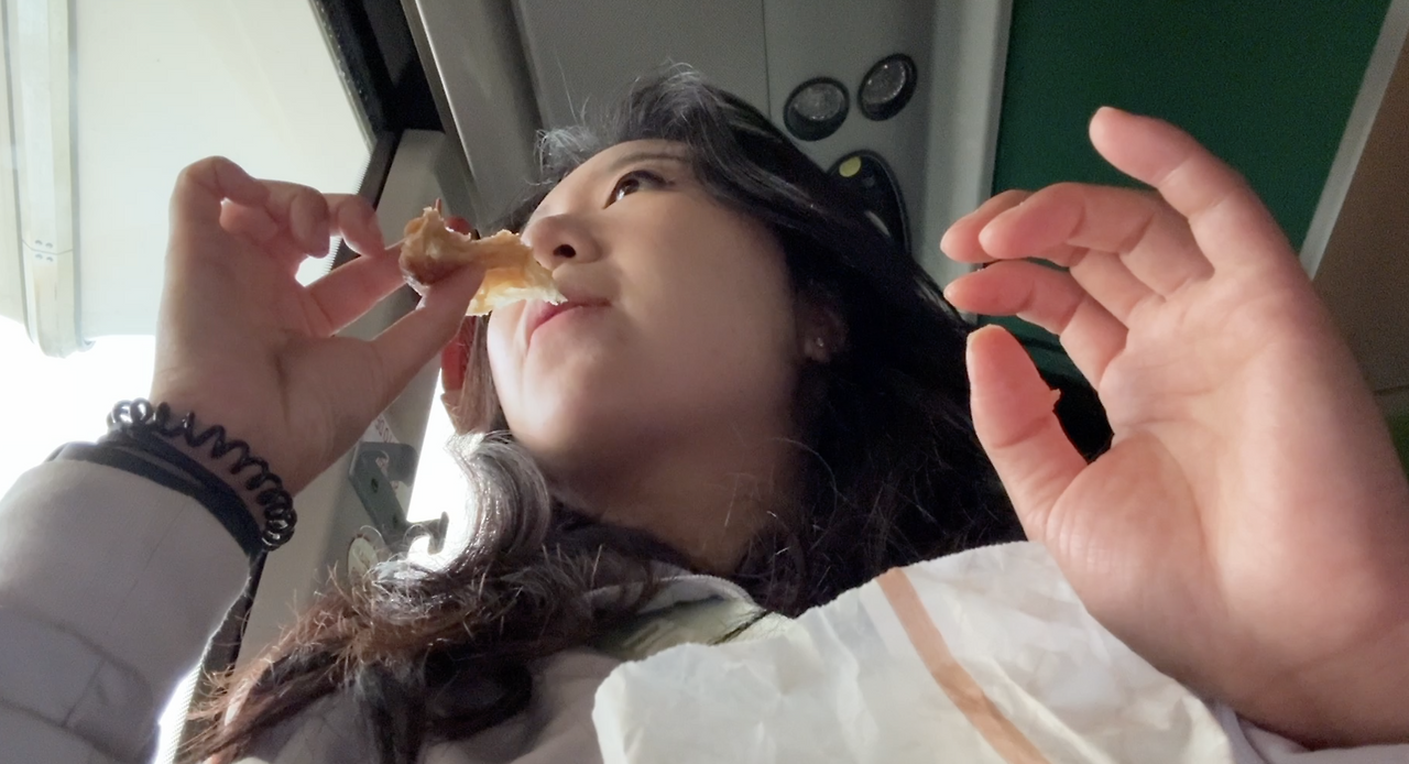 아이스크림을 먹으며 버스가 오길 기다리는 중