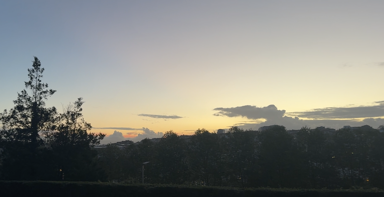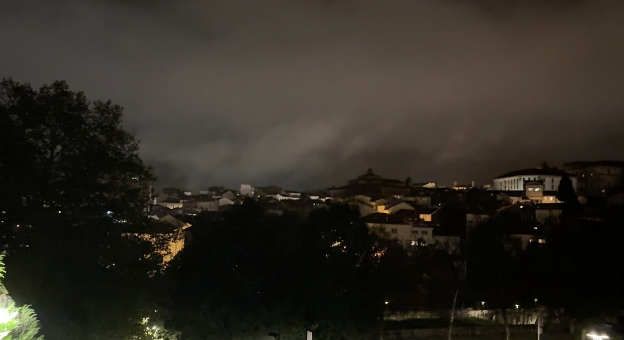 구름 낀 하늘에 마을의 노란 불빛이 으스스하지만 오묘한 기분을 준다.
