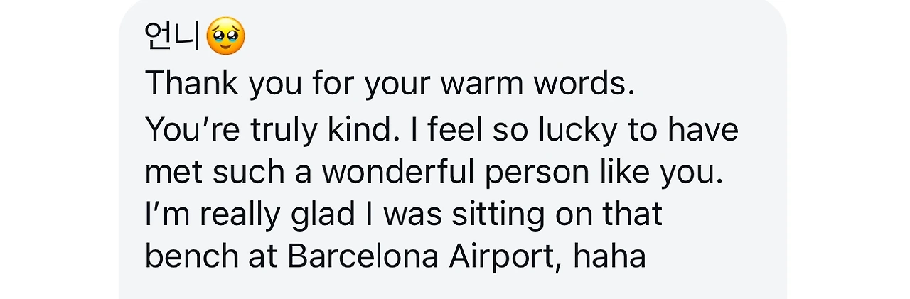 공항에서 우연히 이어진 인연이 지금까지도 계속되고 있다. 어느 날, 사라는 내게 진지한 고민을 털어놓고 싶다며 마음을 나누어 주었다. 내가 가진 생각들을 솔직히 전했고, 감사하게도 그 이야기가 사라의 고민에 조금이나마 도움이 된 것 같았다.