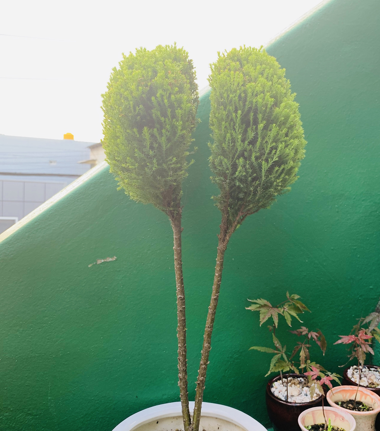 몇 년째 키워 온 율마를 막대사탕 모양으로 기르고 있었다. 나름 만족했다. 어느 날 보니 바람이 통하지 않아서 가운데 부분이 갈색이 된 잎들이 보였다. 마른 부분을 잘라내고 빈곳이 생기도록 철사로 모양을 만들어 가지와 가지 사이에 끼워서 한 달 정도 있었더니 바람이 잘 통하게 되었다. 그 대신에 율마의 모양이 어색해졌다. 고민하다가 전정가위를 들었다. 싹둑싹둑 이발사가 된 것 같았다.