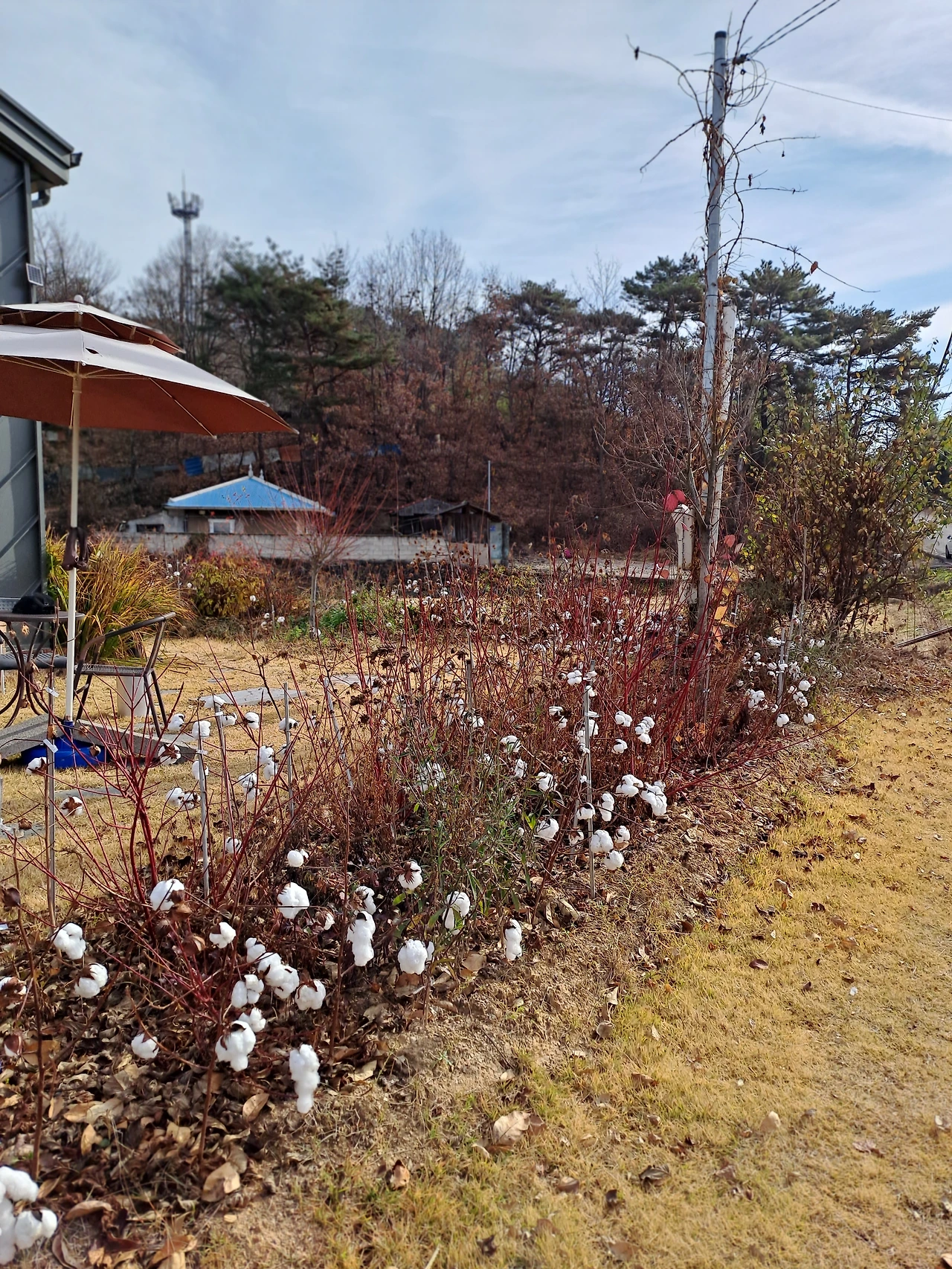 멀리 있는 그이는 초등학교 아들이 아파 병원에 데리고 간다고 좀 늦는다 하여 우리 먼저 간다. 시내에서 좀 떨어져 있어 늦가을의 모습들에 끌리며 가다 보니 하얀 것들이 온 집을 빙 둘러싼 모양새다. 둥둥 떠 있는 것 같은 목화송이. 꼭 누군가 하얀 솜뭉치를 갈색 나뭇가지에 매달아 놓은 듯 자연스럽지 못한 것 같으면서도 실물임을 거부할 수 없다. 목화를 보고 자라지 않았다면 얼마나 신기해했을까.