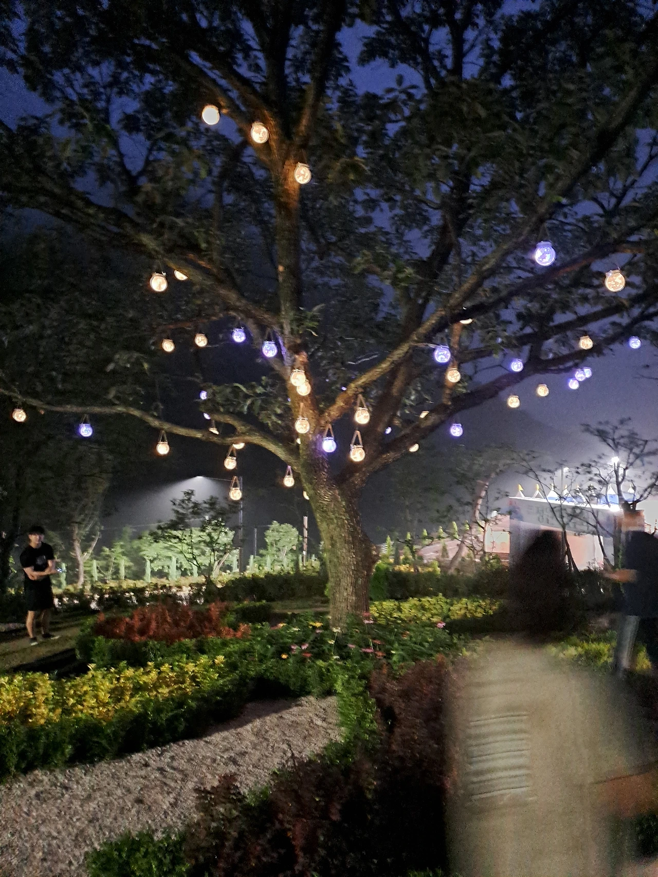 정원박람에 첫날 졸참나무에 매달린 조명들이 어떻게 비추일지 두근거리며 기다렸다. 어둠이 내려야 빛을 발하는 등이다. 주변에 밝혀진 불빛이 없어 별빛같이 어둑웠다. 다음 날 법면 위에 조명이 환했다. 정원은 완벽하지 않고 조금씩 만들어져 간다. 어스름한 빛 가운데 정원이 자태를 드러낸다. 졸참나무와 꽃들이 낮과는 다른 분위기로 살아난다.