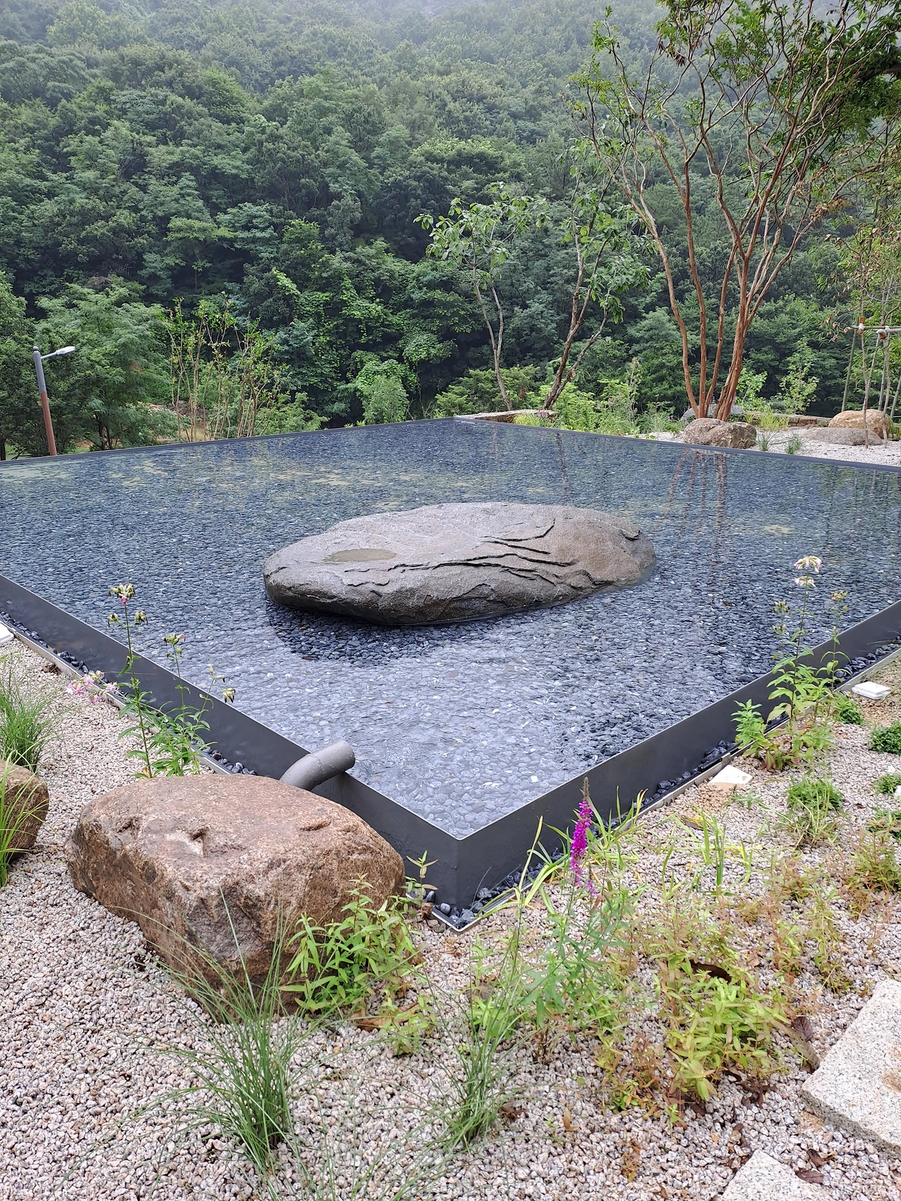 제3의 정원은 네모난 연못이 두 개나 드리웠다. 물가에 앉아 도란도란 이야기를 하면 마음까지도 맑아질 것 같다. 나는 작가와의 만남을 참석하지 못한 것이 아쉬움으로 남는다. 아이들이 잔 돌멩이도 던져 잔물결이 이는 것도 보고, 첨벙하는 소리도 듣기를 원한다고 했단다. 손도 물에 담가 보고. 이것이 진정한 작가의 마음 아닐까. 정물처럼 가만 두어두는 것이 아닌. 눈만 껌벅이는 연못이 아니라 사람들과 숨 쉬는 못이 되기를 작가는 바란다. 너무나 좋았다. 편안하고 푸근한 물정원이 될 것 같다. 보는 정원을 떠나 느끼는 정원이 되기를 바라는 마음이 다가왔다.