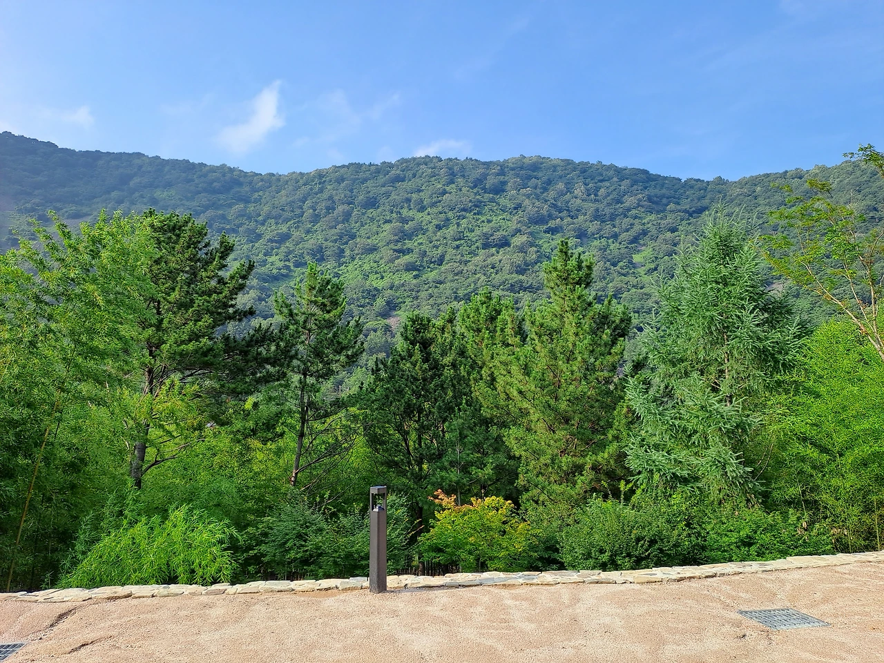징검돌들을 놀이하듯이 밟고 내려가면 제2정원과 맞물린다. 서로 어우러져야 했기에 미련이 남는 부분이 왜 없을까. 작가정원이라는 울타리가 신선한 느낌으로 다가온다. 마주하는 산의 자태가 비 온 뒤에 구름으로 덮여 얼마나 신비감을 더하는지. 기다란 나무둥치를 깎아 놓아 다리 쉼을 할 수 있고, 산의 높낮이를 그대로 이용하여 층의 시간을 가져왔다. 산불이 일어났던 산의 시간을 담아내고 대지의 높이와 나무의 높이에 따라 시선의 층도 나누인다. 층과 층을 이룬 시간들이 하나로 이어져 감각의 층으로 구분된다.
