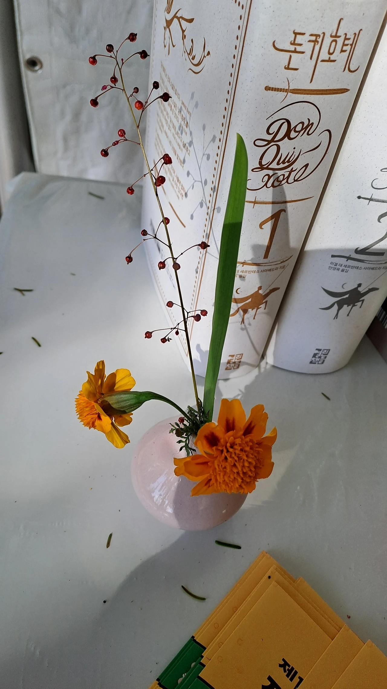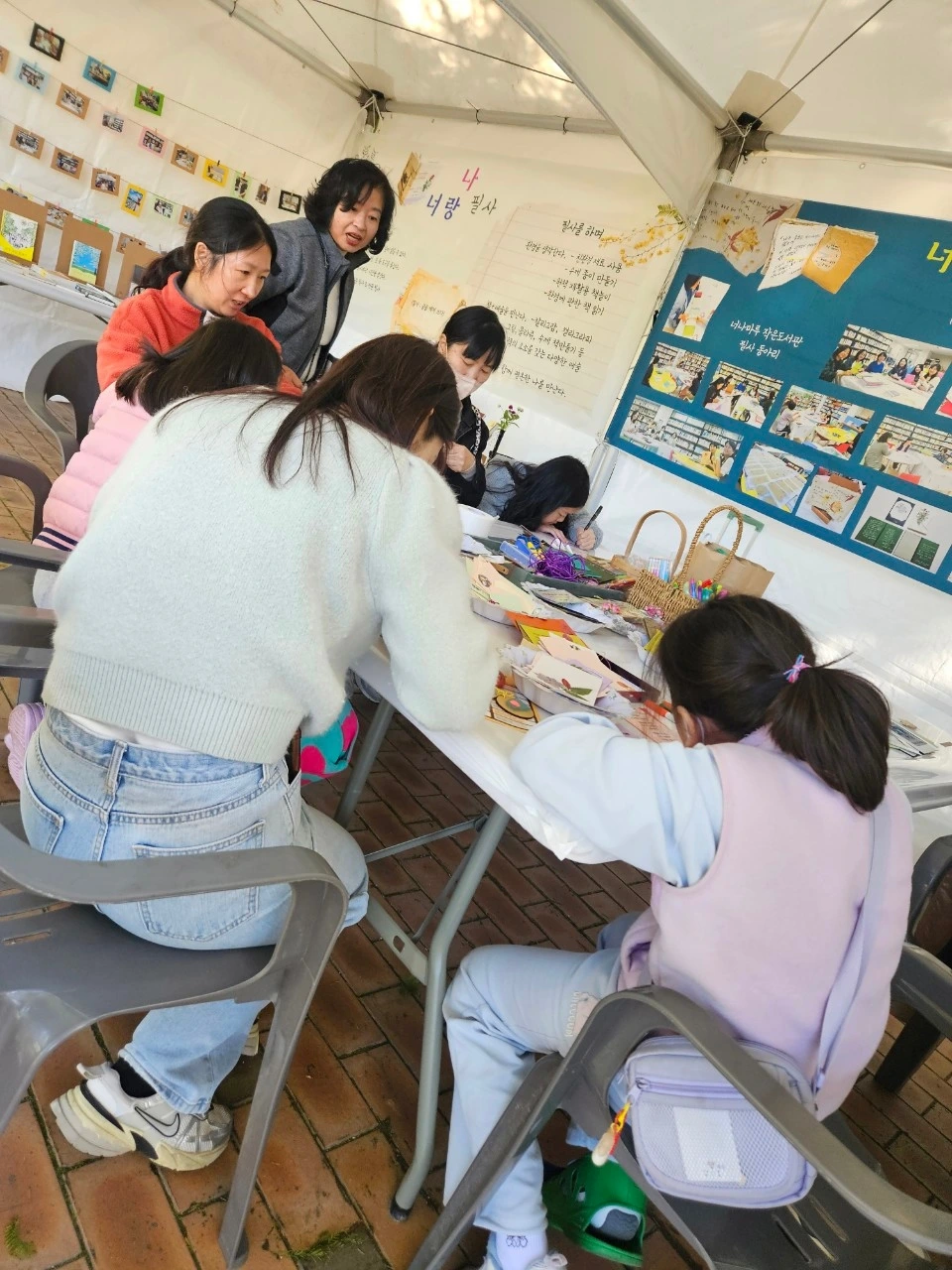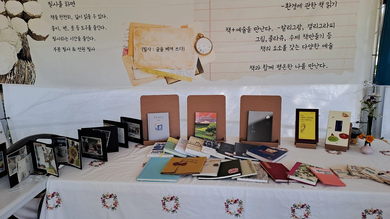 이년에 한 번 열리는 북페스티벌 행사에 필사모임도 같이했다. 시간을 들여 누름 꽃으로 아이들이 쓸 책갈피를 디자인하고, 도서관에서 동시를 읽으며 아이들이 좋아할 글귀들을 먼저 찾는다. 적거나 사진을 찍어 다른 선생님께 보내면 코팅을 하여 완성한다. 읽었던 책을 전시하고 필사한 노트를 펼쳐놓는다. 서리가 내려도 아직 뜰에 핀 꽃들을 가져와 조그마한 화병에 꽂아 놓는 멋도 부린다. 우리들의 이 년 동안의 모습들이 담긴 사진을 종이액자에 넣어 전시를 한다. 옆구리 뱃살이 보기 싫어 그 사진을 빼달라고 해도 살이 어디 보이냐며 그대로 줄 끈에 매어 벽면을 장식한다.