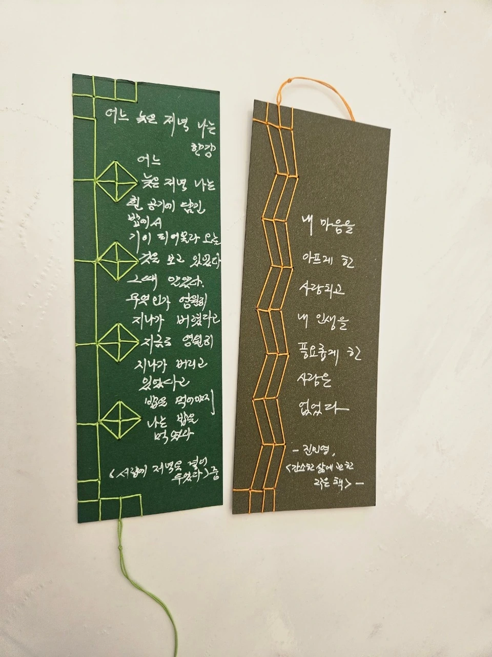 작은 아이까지도 고사리 손으로 필사를 하는 모습을 보고 있으면 기특하다. 아직 글도 제대로 모를 나이의 아이들이 글씨를 베끼고 있는 것을 보면 반반의 마음이 든다. 뺏어서 얼른 대신 따라 써주고 말고 싶은 급한 마음과, 반면 이 아이는 필사라는 것을 처음 해볼 수도 있겠구나! 싶어 완성해 보는 기쁨을 누리도록 해야겠다는 것이다. 기다리고 있는 다음 사람들을 보면 앞의 마음이 더 간절해지지만, 그렇더라도 어떻게 하든지 아이가 다 마무리할 수 있도록 인내심을 갖는다. 어린 날의 책갈피 하나 마무리해 보는 동작이 그 아이에게는 얼마나 소중한지 모르기 때문이다.