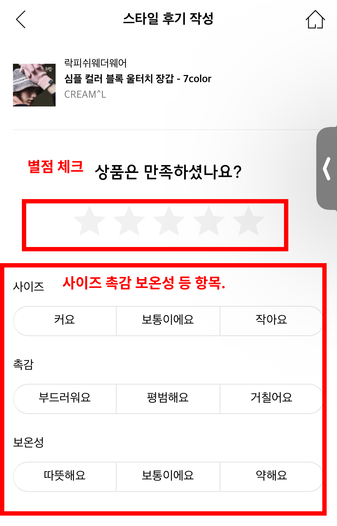 - 옷과 관련한 평가기준인 "사이즈, 평가, 색감, 두께감, 보온성, 무게감" 등 다양한 항목에 대한 리뷰를 작성할 수 있게 되어있으며 이것이 후기란에 나타난다.