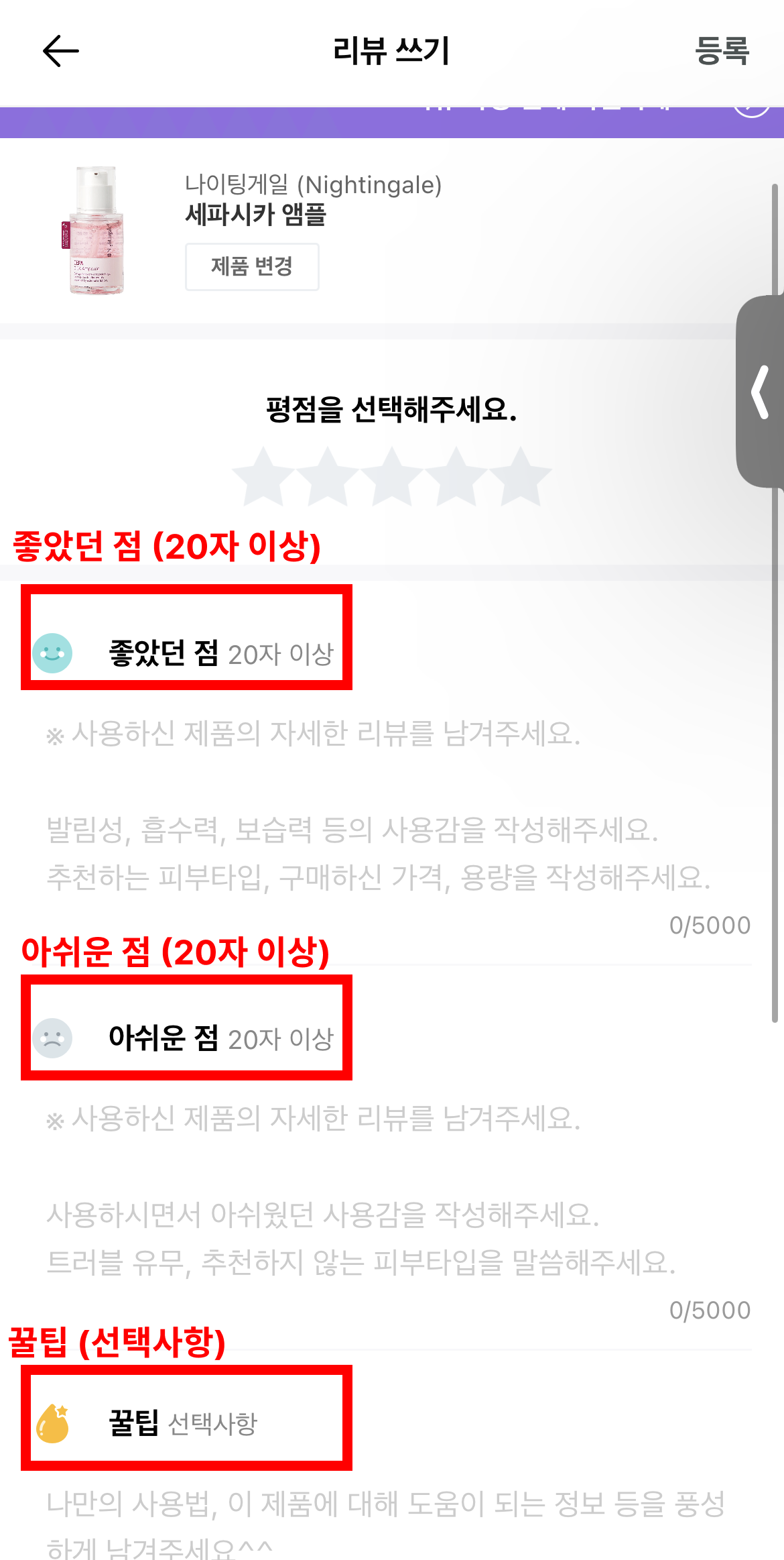 - 작성 과정에서 적절한 템플릿과 강제성 부여 (글자수 이상 등..)를 통해 좋은 후기를 제출할 수 있게 유도한다. 텍스트,이미지 뿐 아니라 세부 항목들에 대한 평가가 필요하다면 이것까지 UX로 잘 녹여내어 좋은 후기를 쉽게 제출할 수 있게 유도하자.