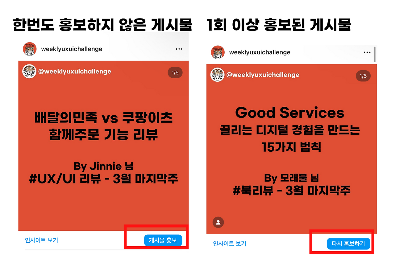 게다가 한 번 홍보한 게시물의 경우 다양한 지표들을 보고 "또 홍보하고 싶다..반응 좋았는데." 등의 생각을 할 때 바로 광고를 다시 돌릴 수 있도록 "다시 홍보하기" 버튼까지 배치되어 있습니다.