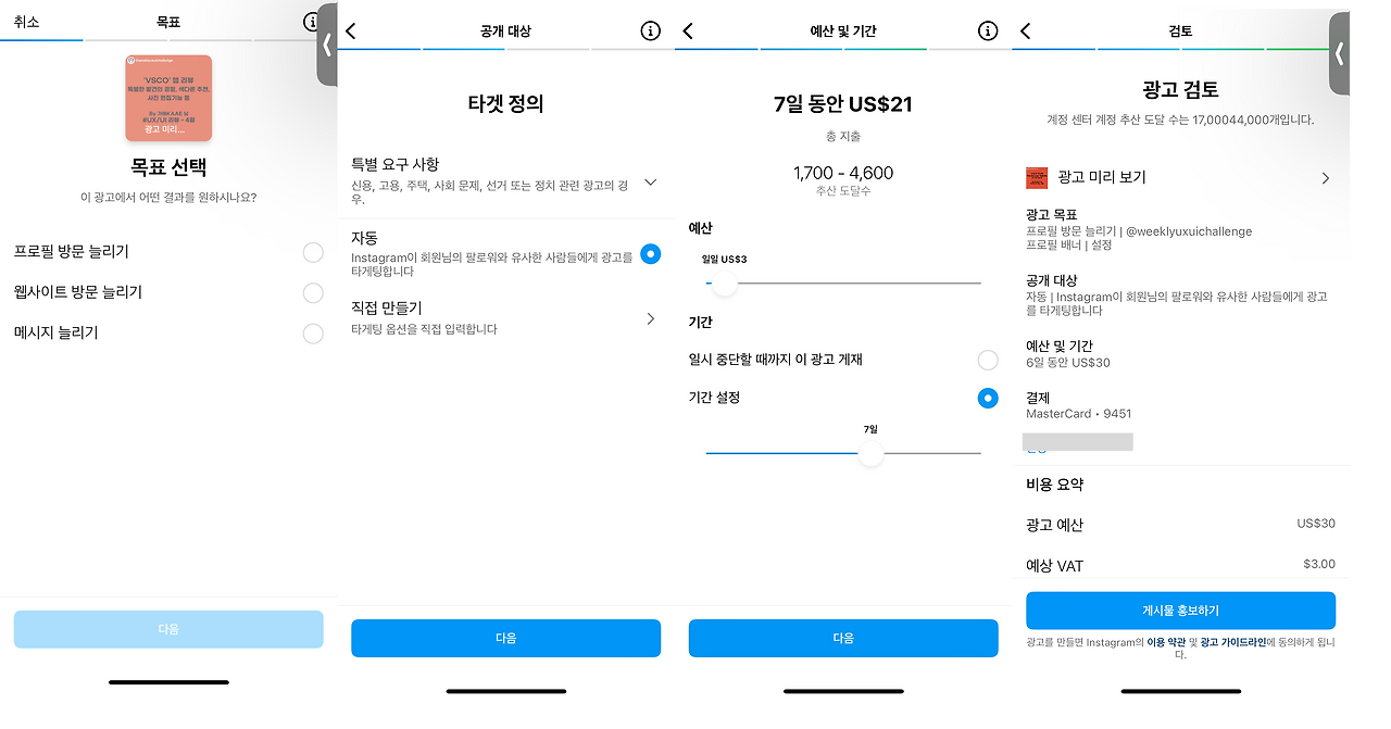 그래서 인스타그램 광고집행 기능은 잘 보이고, 이해하기도/쓰기도 쉬웠지만 "다시 쓰고 싶은" 기능이었습니다. 실제로 이후에 중독(?) 되어서 약 5개의 포스팅에 대한 광고를 집행했습니다.