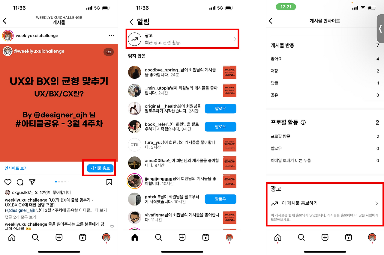- 각 게시물 별 반응을 확인할 수 있는 공간에서 진한 파란색 버튼으로 표시되어 있고, 내 계정단위위 좋아요 / 팔로우 등을 확인하기 위해 들어가는 "알림" 탭의 최상단에 광고관련 인터페이스가 위치해있고, 각 게시물 별 좋아요 수 / 저장 수 등 영향력을 데이터로 확인하는 공간인 "게시물 인사이트" 화면의 최하단에도 '이 게시물 홍보하기' 와 같은 버튼이 있습니다.