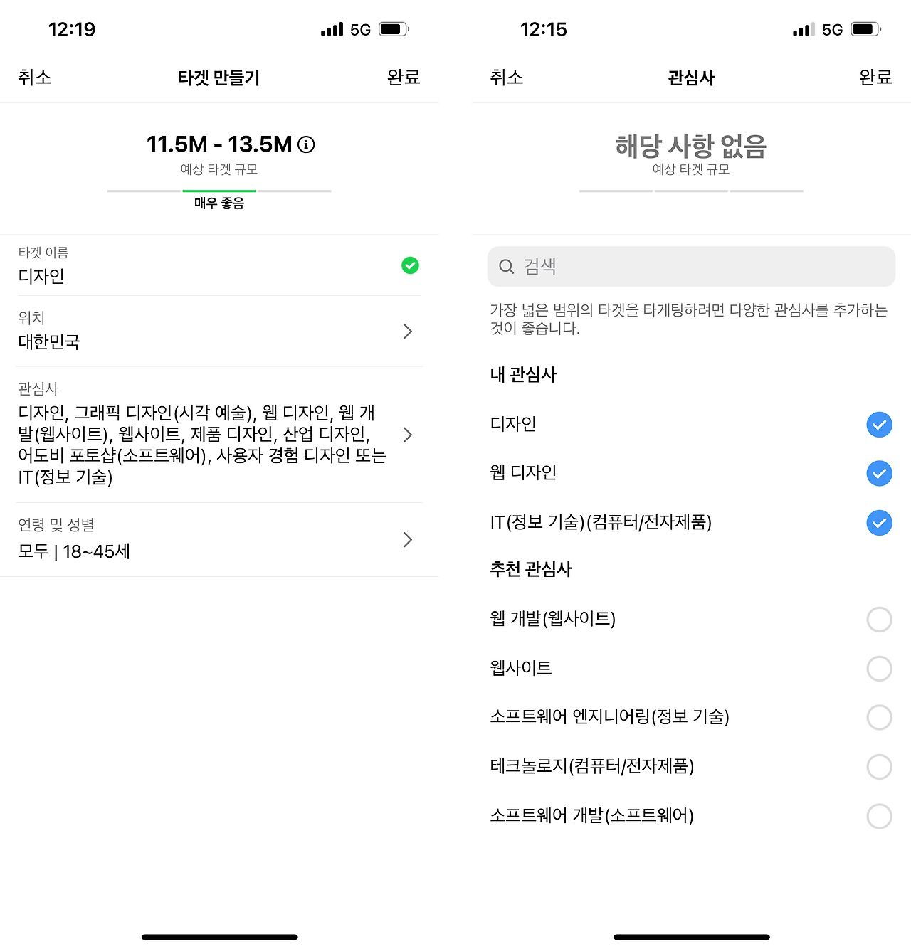- 이것도 너무 간단했습니다. 마케팅 타겟설정..등을 생각하면 인구통계학적인 뭔가라던가.. 등등 어렵지 않을까? 라는 생각이 들었는데 타겟설정에서 별다른 지정없이 맡길 수 있는 "자동" 옵션도 제공되어있고, 아래의 사진처럼 직접 타겟을 설정할 수 있는 옵션도 제공이 되었습니다.