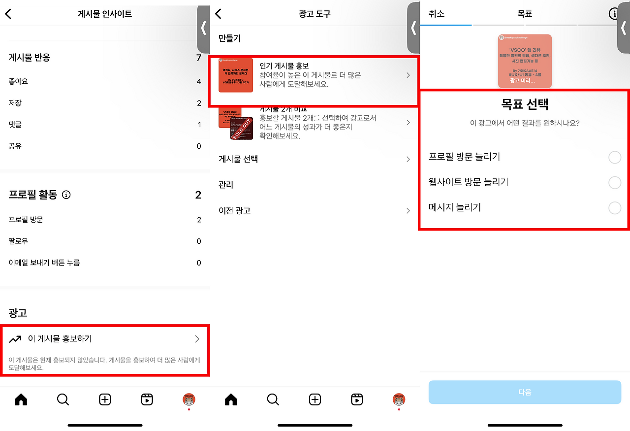 <게시물 홍보 기능으로 진입할 수 있는 버튼 등은 어디에 노출되는지?>