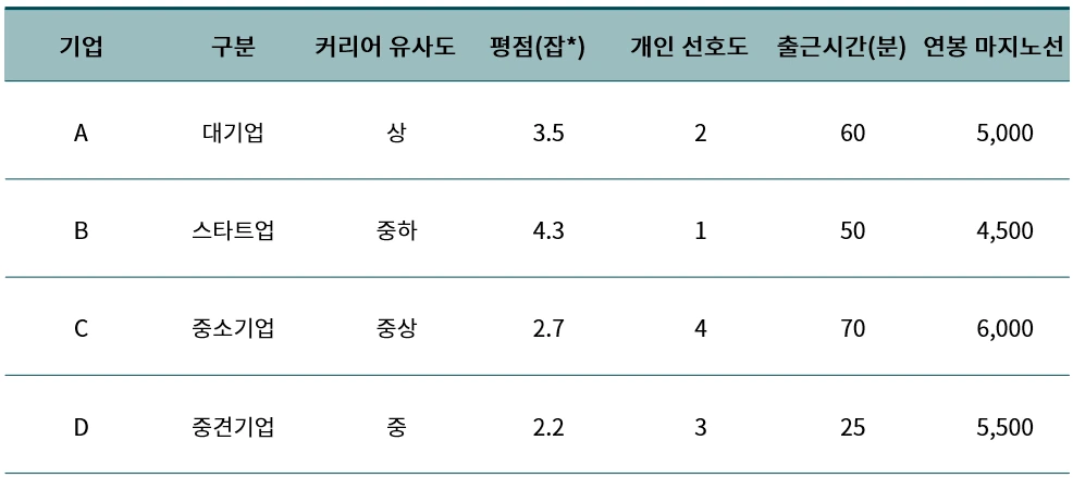 2) 작성한 표를 보니 평판도 낮고, 개인적으로 선호도도 낮고, 출근시간도 멀다.