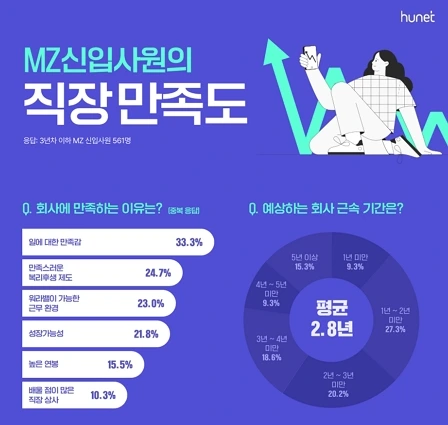 왼쪽은 휴넷에서 3년 차 이하 신입사원을 대상으로 조사한 직장 만족도 통계자료이고,