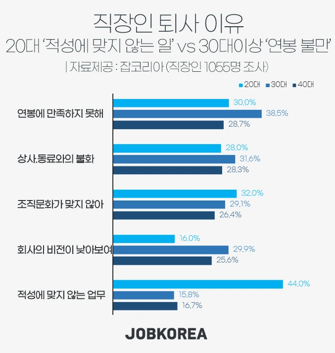 잡코리아에서 22년에 조사한 직장인 퇴사사유 통계자료입니다.