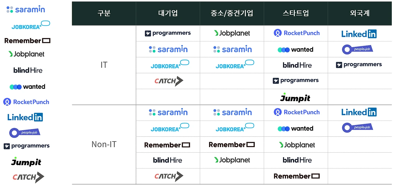 1) IT와 Non-IT, 기업규모에 따라 강세를 보이는 채용플랫폼을 각각 배치해 보았습니다.