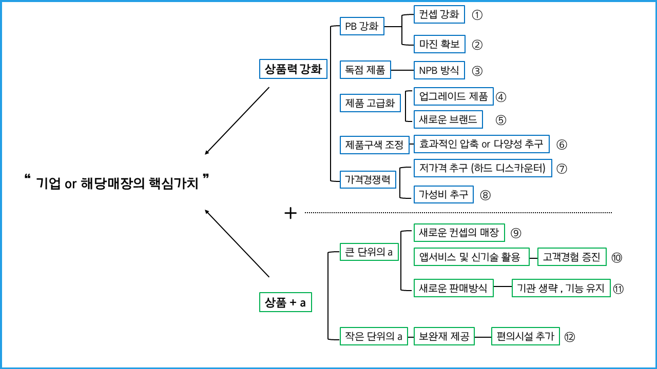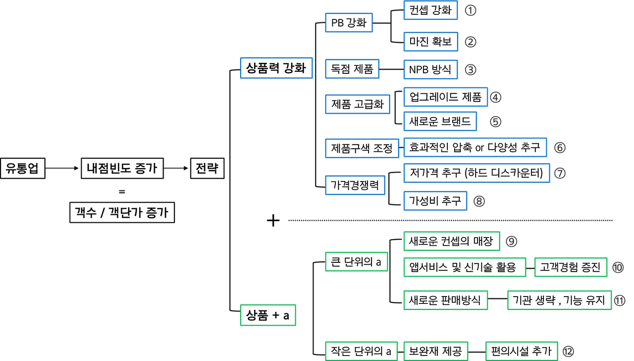 단기간의 객수를 증가시키는 것보다는 고객 한 명당 내점 빈도를 높이는 것이 객수와 객단가 증가의 효과로 이어질 가능성이 높기 때문이다. 따라서 이에 대한 전략을 크게 상품력 강화(제품 관점)와 상품+a(서비스 관점)로 구분했고 세세한 전략들에는 1~12번까지 번호를 매겼다. 각 전략들에 대한 설명은 다음과 같다.