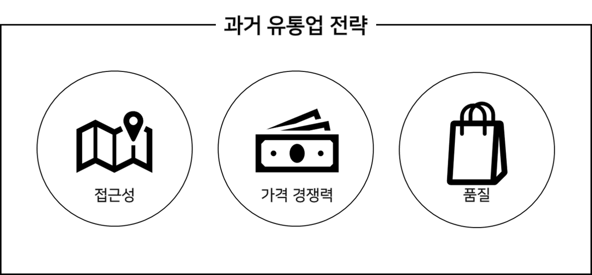 과거의 유통업에서는 접근성 좋은 입지조건과 제품의 품질, 합리적인 가격 등 효율성을 강조하는 것이 주된 전략이었다. 하지만, 이러한 조건들은 더 이상 차별화 조건이 아닌 대부분의 유통업에 속한 기업들 혹은 유통매장이 갖춰야 할 기본적인 조건이 되었다. 소비자들을 만족시키기 위해서는 차별화된 강점이 필요한데, 접근성과 가격 경쟁력, 제품의 품질은 소비자들을 방문하게 하는 이유 중 하나 일수는 있지만 우리 기업과 우리 매장만의 차별화된 강점으로 소비자들은 인식하지 않는다.