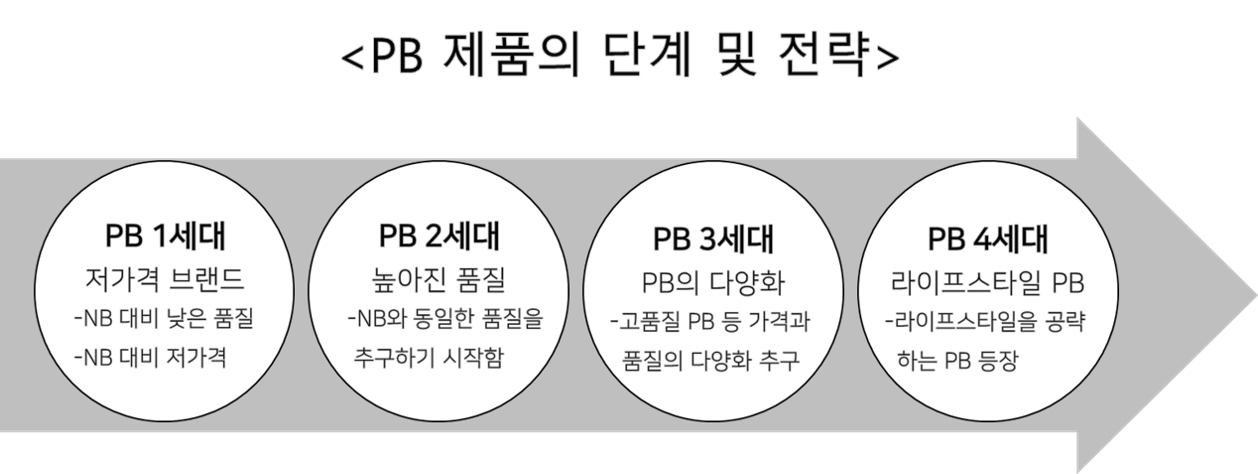 낮은 품질의 저가격만을 추구하던 PB 1세대부터 고급화 등 다양한 제품 라인을 넘어 이제는 소비자들의 라이프스타일 니즈를 만족시키는 PB 4세대까지 예전부터 PB 제품들은 지속적으로 발전해왔다.