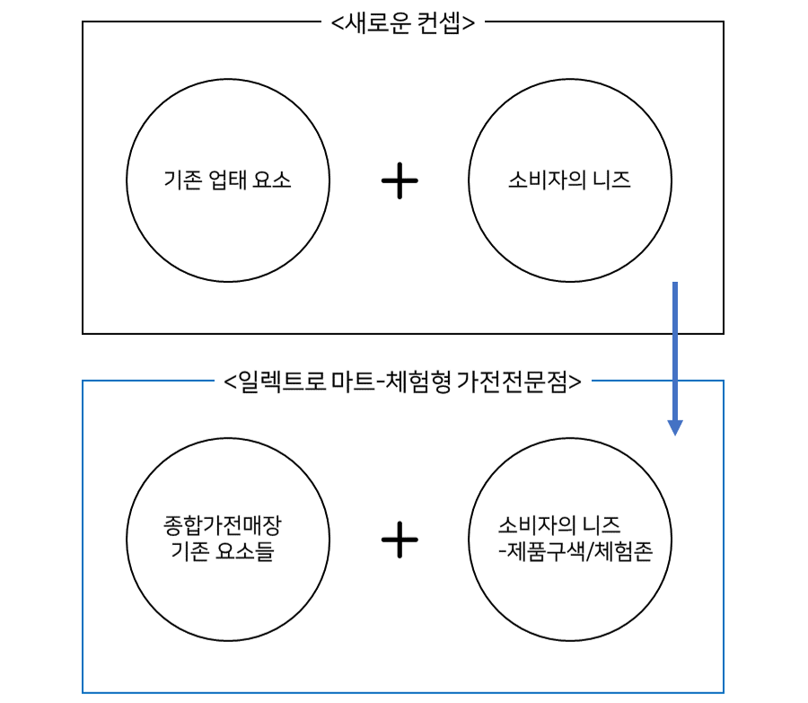 종합가전 전문점에 다양한 제품 체험존을 제공하고, 종합 할인점에 다양한 체험적 요소와 B급 감성을 추가한 일렉트로 마트와 삐에로쑈핑처럼 일반적인 업태에 확실한 콘셉트를 추가해서 핵심가치를 제공할 수 있다. 여기서 성공 조건은 새로운 콘셉트 자체가 핵심가치이기 때문에 효과적인 콘셉트 구축을 위해서는 기존 업태에서 추가적으로 소비자 니즈를 만족시킬 수 있는 요소를 더해야 한다는 점이다. 이후 매장 내 모든 전략들이 콘셉트를 강화하는 방향으로 이어지는 것 또한 중요하다.