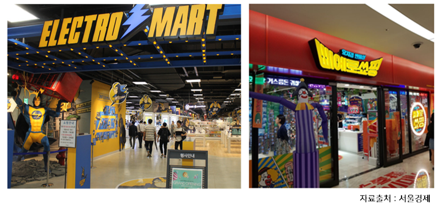이에 해당하는 사례로는 '일렉트로 마트'와 '삐에로 쇼핑' 이 있다. 먼저 일렉트로 마트는 드론, 스마트기기, 애플샵 등 다양한 가전제품을 판매하는 체험형 가전 전문점이다. 일렉트로 마트의 핵심가치는 종합가전 전문점이라는 업태에 일반 매장에서는 보기 힘든 제품 구색과 체험적 요소를 추가해서 즐기면서 제품을 구경할 수 있는 체험형 매장이라는 콘셉트이다. 이러한 콘셉트는 매장 내 다양한 체험존과 공식 캐릭터로 꾸며진 매장 분위기와 함께 소비자들에게 전달된다.