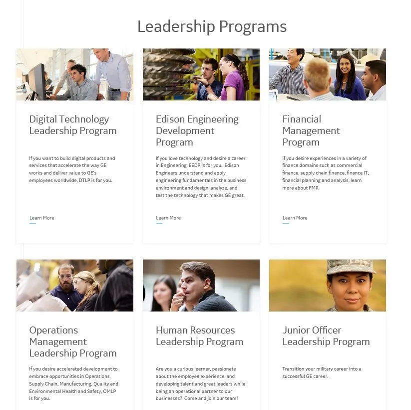 경제지를 읽다 보면 볼 수 있는 큰 회사들은 보통 모두 이런 프로그램을 갖고 있다. 예를 들어 GE의 공식 홈페이지의 채용란에 가보면 아래와 같이 다양한 리더십 프로그램을 운영하고 있는 것을 알 수 있다.