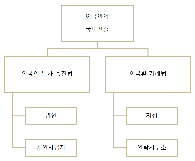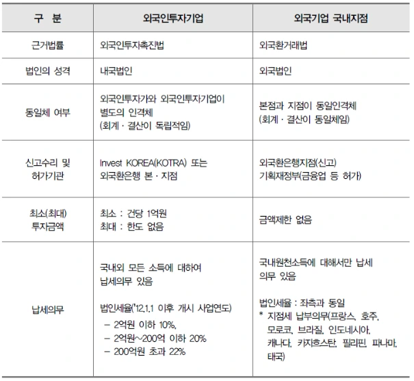 반면 후자인 외국환 거래법에서의 진출 유형은 국내 산업 발전에 이바지하기보다 투자자의 필요에 의해 진출한 소규모 외국계 자본을 규정하는 성격이 짙다. 따라서 세제혜택이 전무하며 각종 추가 세목을 부과하여 일정 규모 이상의 사업체에는 불리하게 작용한다.