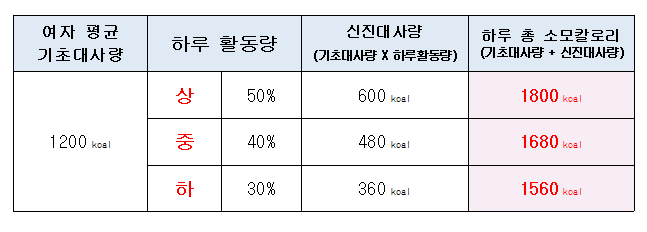 하루 먹은 음식 총 칼로리 < 기초대사량 칼로리 + 신진대사량 칼로리