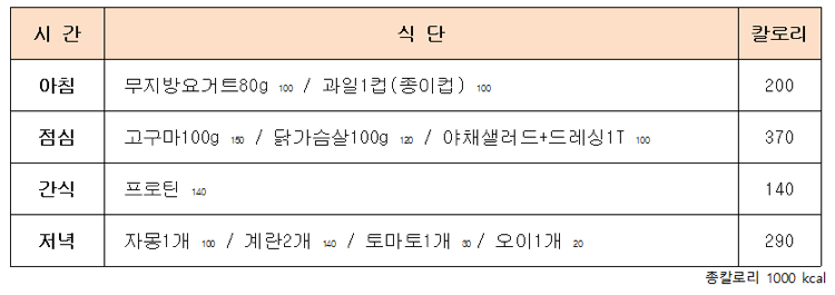 자, 위는 직접 짠 하루 1000kcal 다이어트 식단이다. 식단에는 모두 칼로리가 표기되어 있다. 이 식단을 최대한 지키다가 어떤 음식이 너무 먹고 싶다면 위 식단을 줄이고 줄인 칼로리 만큼만 먹고 싶은 음식을 섭취하는 것이다.
