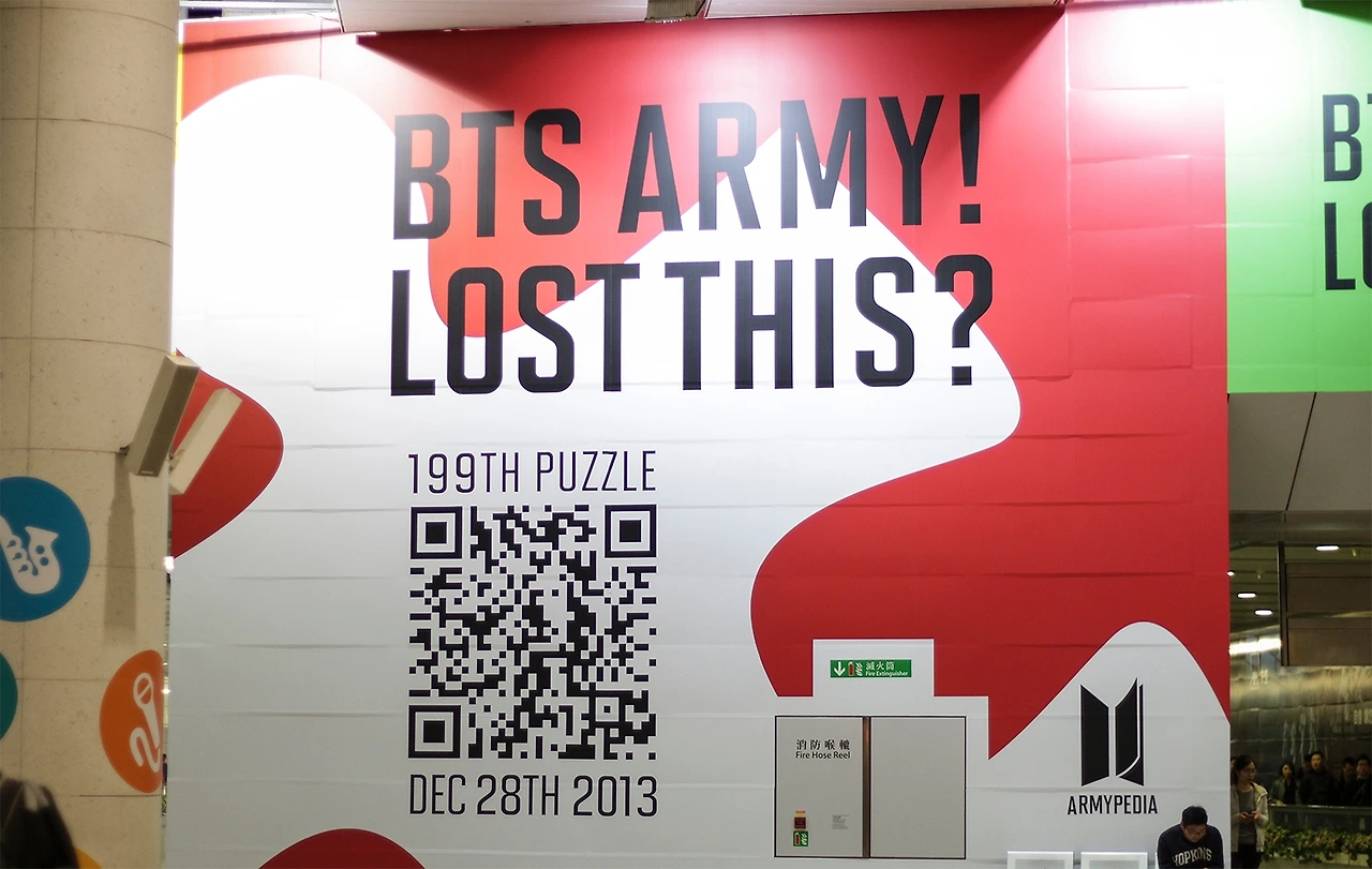 집으로 가는 지하철역의 한 벽면을 가득 메우고 있는 이 광고의 정체가 무척 궁금했다. 뭔가 싶어 찾아보니 '아미피디아'라고 하는 것이었다. 전 세계에는 현재 방탄소년단의 지난 자취를 저장하고 있는 퍼즐 조각이 2,080개가 흩어져 있다고 한다. 방탄의 팬덤인 '아미'들이 4주의 시간 동안 이 조각들을 찾아서 문제를 풀고, 하나로 합쳐내는 작업을 해야하는데, 이것은 그 중에 199번째 조각이다.