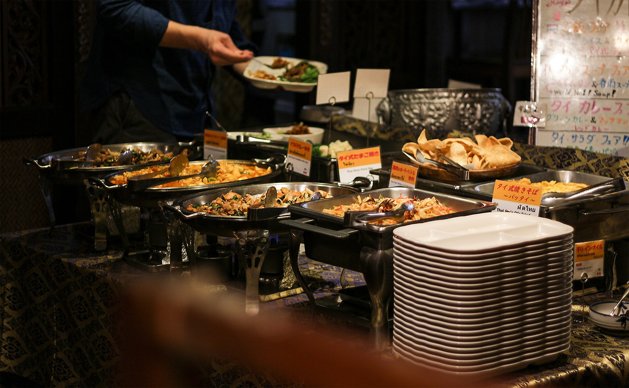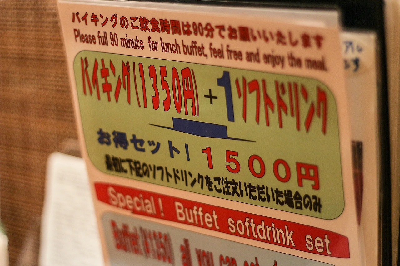 요리를 늘어놓고 한가로운 시간을 즐길 수도 있지만 이곳의 점심에는 단 돈 천오백엔으로 한시간 반 동안 즐길 수 있는 뷔페가 있다.