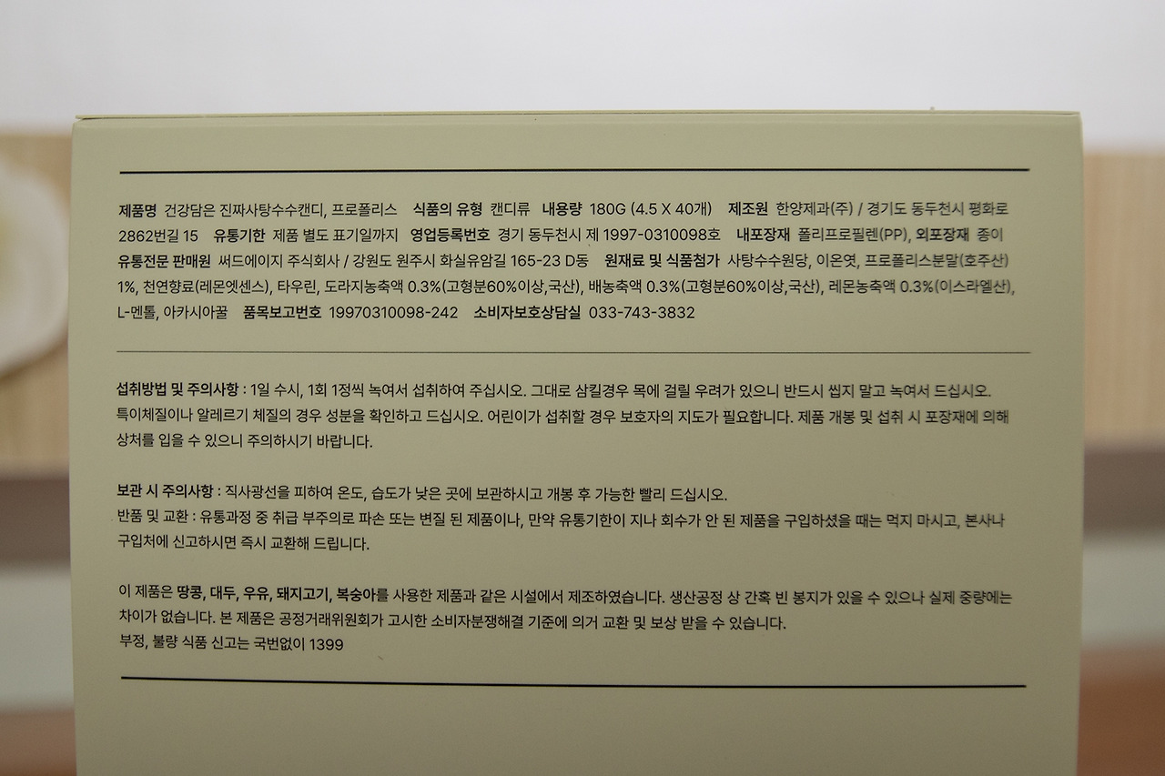 진짜와 가짜 구분이 의미가 있나 싶긴 하지만 어쨌든 진짜 설탕과 프로폴리스가 들어갔다는 것이 핵심이다.