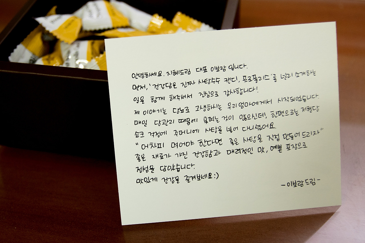 어쨌든 와디즈에서 펀딩을 마치고 얼마 전부터 스마트스토어에서 열심히 팔기 시작했다. 뭐가 됐든 열심히 팔아서 건물.. 까지는 힘들 거고 직원 너덧명 월급은 줄 수 있는 제품으로 만드셨으면 한다. 열심히 잘 만든 사탕이니깐 언젠가는 빛을 보는 날이 올 거라 생각한다. 그때까지 누나가 존버 또 존버 하시길 바라면서 감사인사 겸 홍보 겸 지난 시간의 회상을 마무리해볼까 한다.