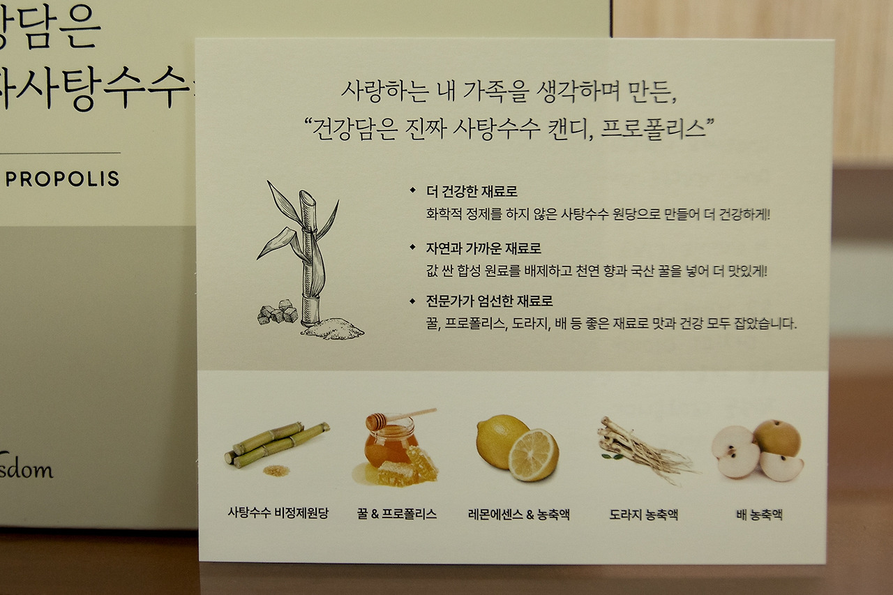 '진짜사탕수수' 캔디가 본론인 것 같지만 사실 핵심은 프로폴리스다. 가장 위에 명조체로 써놓은 문장만 읽어봐도 그 의도는 명백하다.
