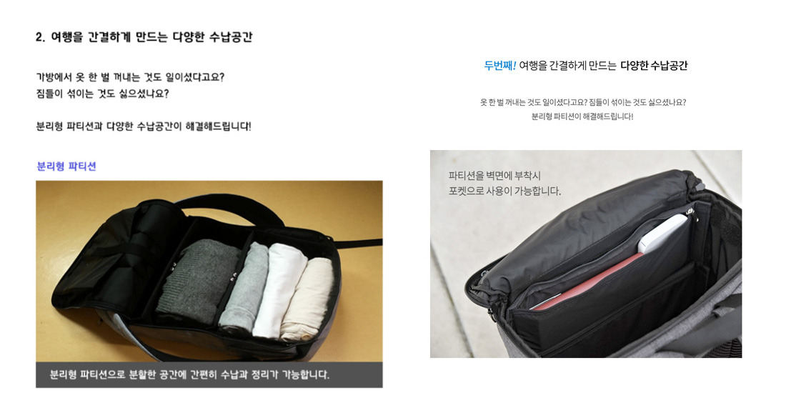 그래도 참으로 다행인 것은 하루의 시간이 남아있었다는 것이다. 화요일 아침이 밝자마자 인천공항으로 향했다. 촬영을 도와줄 사람도 없으니 어떻게 찍어야 하나 고민을 할 것도 없었다. 혼자 삼각대 위에 카메라를 얹어두고는 제품이 화면에 꽉차게 적당히 확대한 다음, 초점만 맞추면 끝이었다. 약간의 시행착오 끝에 크로스백을 분리하는 장면, 칸막이를 사용하는 장면, 시크릿 포켓에서 여권을 꺼내는 장면까지 촬영을 완료하였다. 물품 보관함에 가방을 넣는 장면은 도저히 혼자서 찍을 수가 없었기에 저녁을 먹자는 빌미로 근처에 사는 친구를 꾀어내어 김포공항 옆 어느 대형마트의 물품 보관함에서 촬영을 마무리 할 수 있었다.