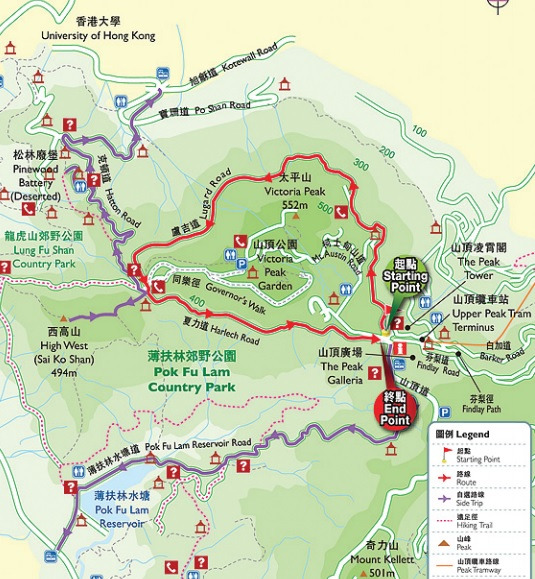 저 빨간 별표의 장소는 Hong Kong Zoological & Botanical garden이라는 곳이다. 동물원이 있는 정원인데, 저기에서 빠져 나와서 위로 올라가서 어떻게든 Old Peak Road를 찾기만 하면 된다. 그 종점에 상당히 고급스러운 아파트 단지가 나올텐데, 그 뒷길을 타고 한시간 정도 올라가면 피크에 닿을 수 있다.